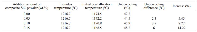 Fig. 10 and Table 6 show the differential scanning calorimetry (DSC) curves and analysis results of different addition amounts of composite SiC powder. As demonstrated in Fig. 10, the starting temperature for crystallization decreases with the increasing amount of composite SiC powder. Consequently, the undercooling (i.e., the difference between initial crystallization tem- perature and liquidus temperature) of composite SiC powder increases with the amount of added composite SiC powder. When 0.05 wt.%, 0.10 wt.%, and 0.15 wt.% composite SiC powder was added, the undercooling of the powder increased by 2.3 oC, 3.7 oC, and 6 oC, respectively.