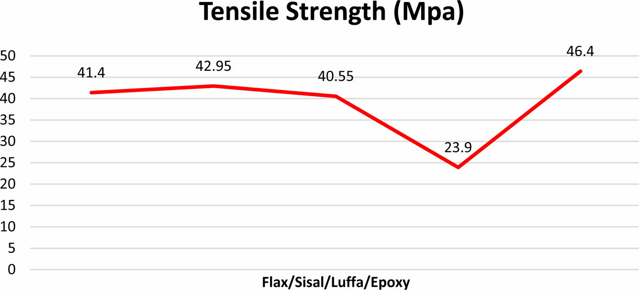 • Based on the result, the tensile strength has been increased for 10% flax/5% kenaf/25% wood/60% epoxy by 46.4 Mpa while decreased for 10% flax/25% kenaf/ 5% wood/ 60% epoxy by 23.9 Mpa.