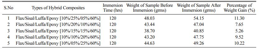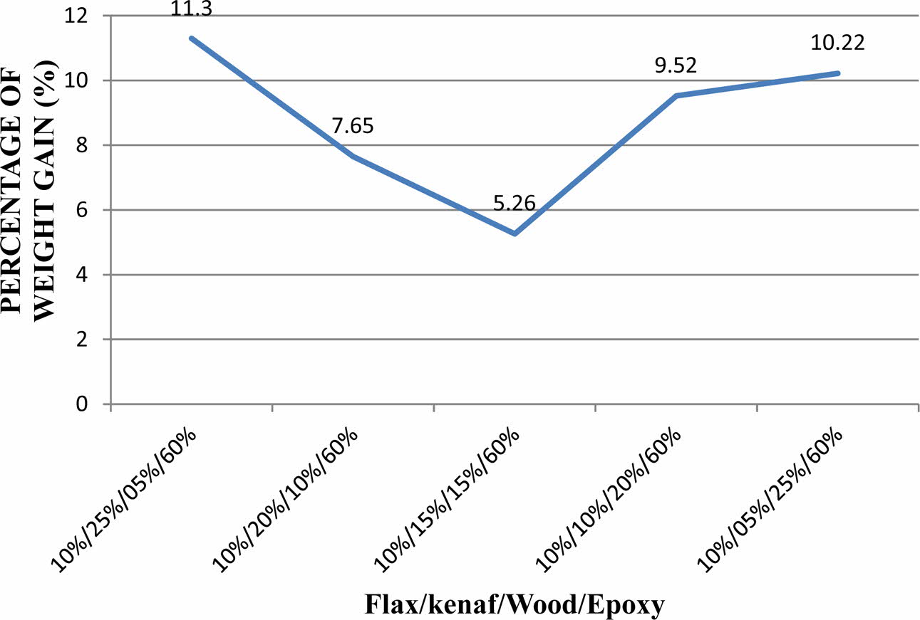 Fig. 4 Types of Hybrid Composites vs. Percentage of Weight Gain (%). |