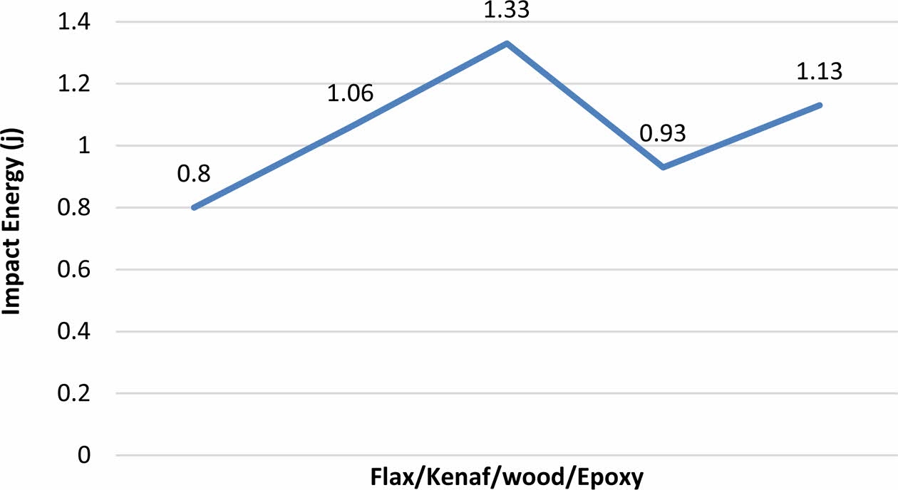 • Based on the result, the impact strength has been increased for 10% flax/15% kenaf/15% wood/60% epoxy by 1.33 J while decreased for 10% flax/25% kenaf/5% wood/60% epoxy by 0.8 J.