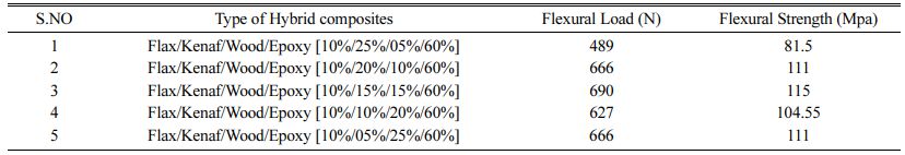 • Based on the result, the flexural strength has been increased for 10% flax/15% kenaf/15% wood/60% epoxy by 115 Mpa while decreased for 10% flax/25% kenaf/5% wood/60% epoxy by 81.5 Mpa.