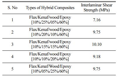 The Inter laminar shear strength of the composite laminates for different combinations of hybrid composites are shown in Table 3. The maximum ILSS of 10.10 Mpa is observed for combination of 10% flax/5% kenaf/25% wood/60% epoxy among all hybrid composites. The minimum ILSS of 7.16 Mpa is observed for com- bination of 10% flax/25% kenaf/5% wood/60% epoxy hybrid composite. Interlaminar Shear Strength property for a composite material is subjected to transverse loads and it is used to measure the shear strength between the laminate plates. ILSS is determined by short beam shear test.