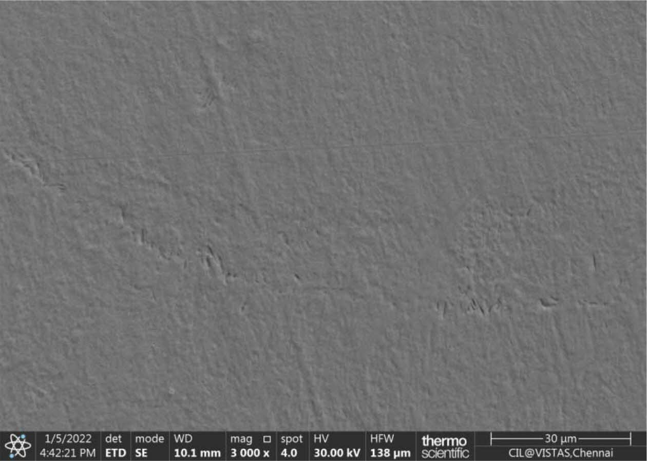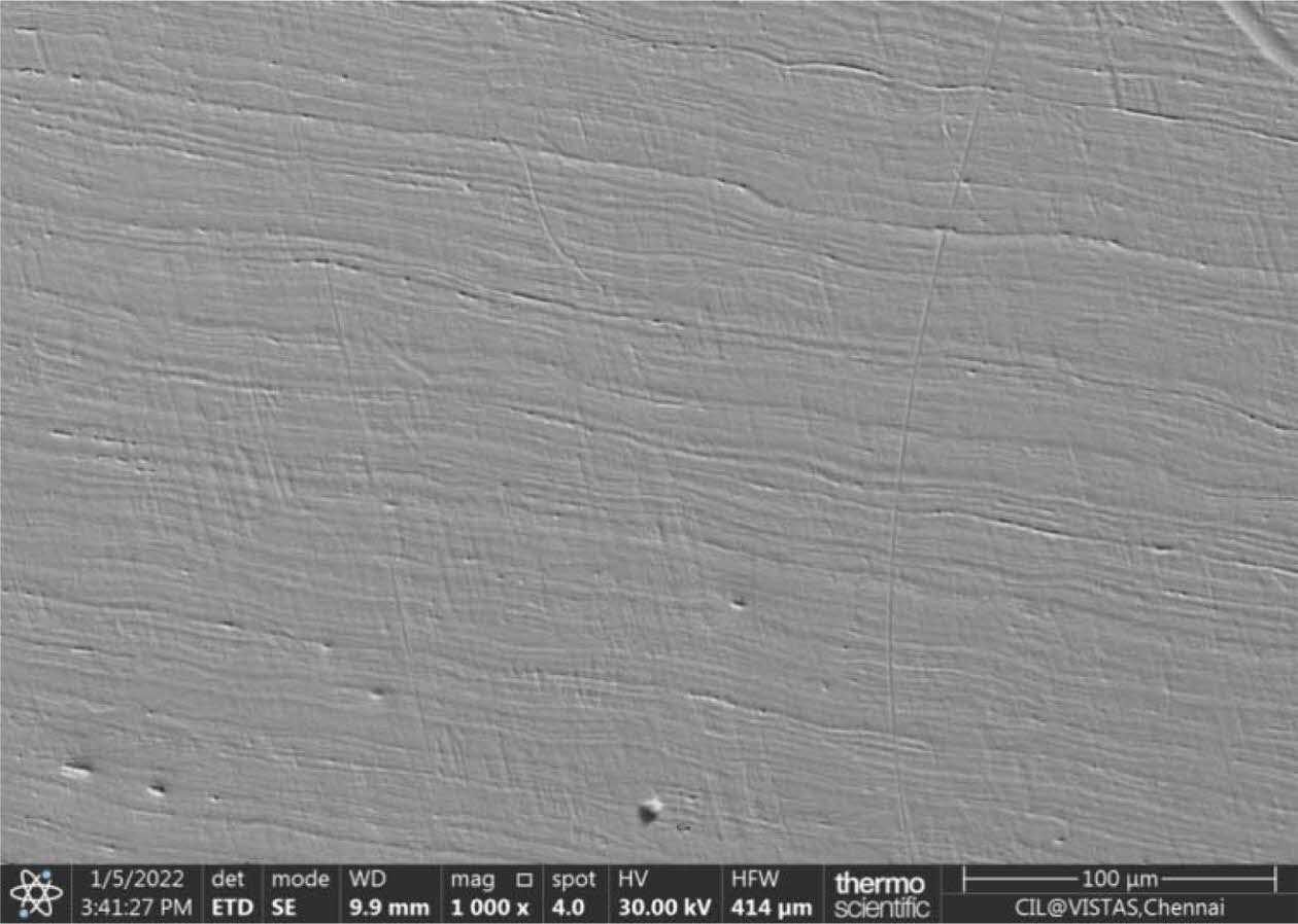 Fig. 3 shows the Microstructural view of Incoloy 825, normally Ni alloy has high nickel and chromium content for high strength. The image shows there is no defect over the Ni alloy material surface. Fig. 4 shows the microstructural view of stainless steel 316L, which has high Chromium content (17%) to increase the strength and reduce corrosion.
