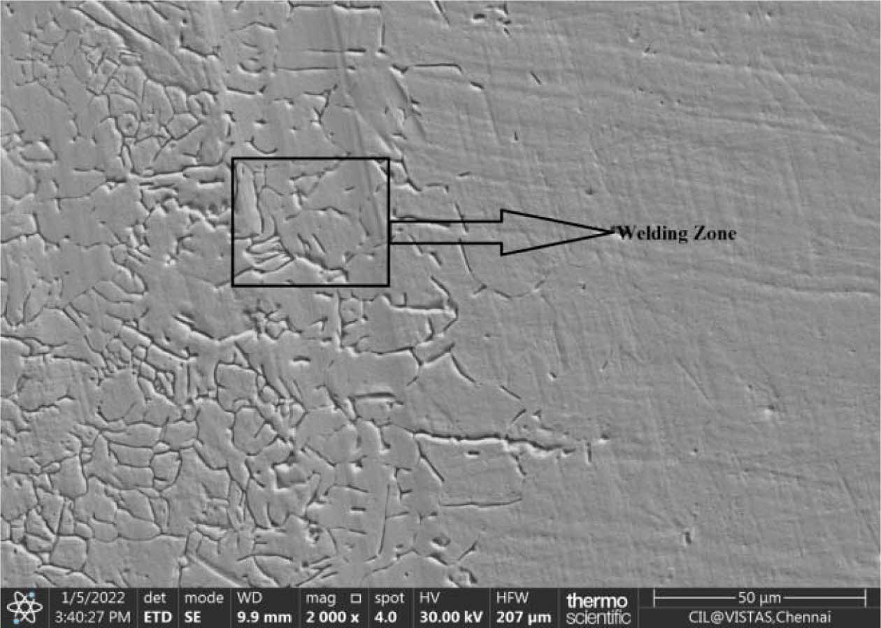 No detectable defects on the welding surface of the sold bead or adjacent areas at the intersection of the welding joint are noticeable in the relevant field. Due to the specimen welded in energy 2.5 J and even welded beads, the welding properties of the pulsed laser beams suggest no welding crises between the two components, and this may occur due to stainless steel 316L, and Incoloy 825 has a normal tolerance to crashes as well as optimal soldering parameters. The metal sold does not indicate any discontinuity. The gas shielding's effectiveness is demonstrated to withstand oxidation, high porosity, and incorporation of gas and gas. Direct heating and energy delivery are both laser-welded in the conduction mode. The SS316L and Incoloy microstructure studies are shown in Figs. 3 and 4. The absorption of the beam energy by the material surface was included in the direct heating process. In Fig. 5, the laser strength stimulates some of the minute surface shoes, the 9th weld region's microstructure, and the heat-affected area.