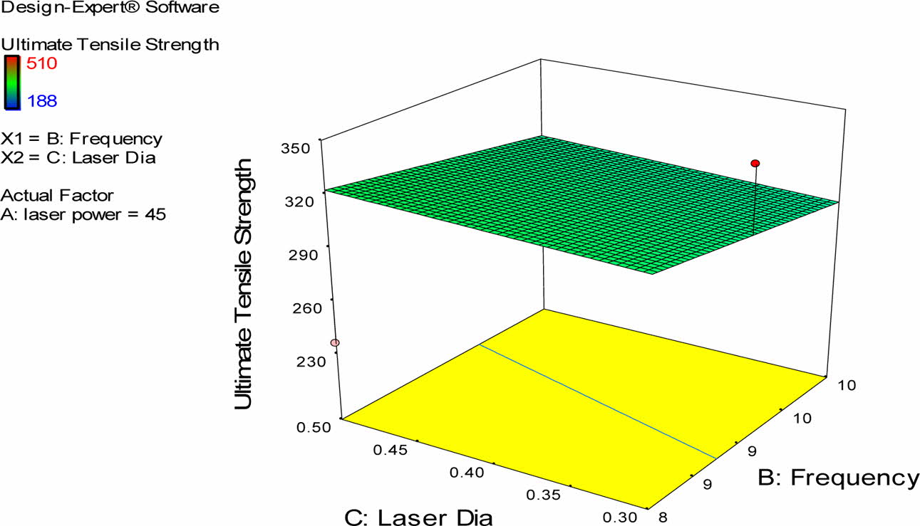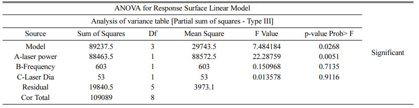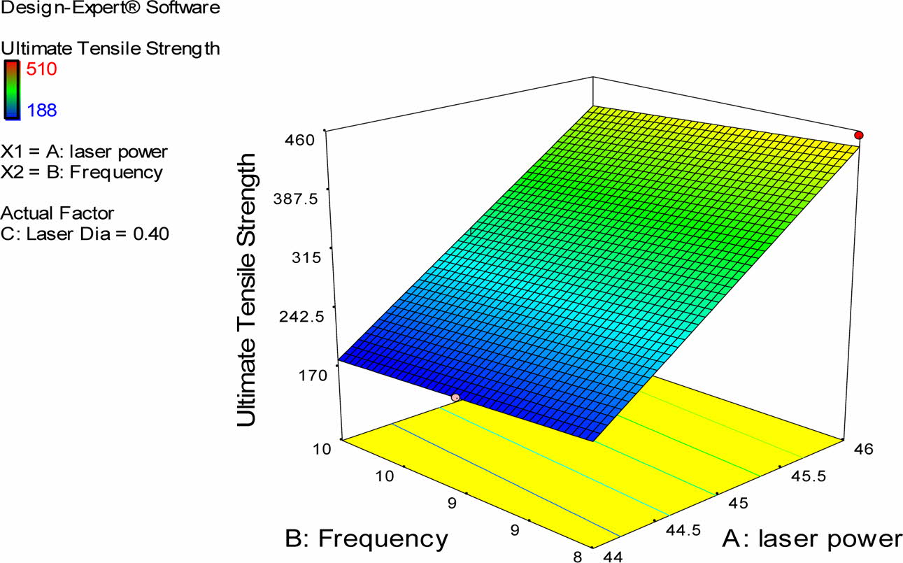 Tensile strength = -5078.16 + 31 *laser diameter + 120.4*Power + *-11 Frequency is the mathematical model observed from ANOVA table.