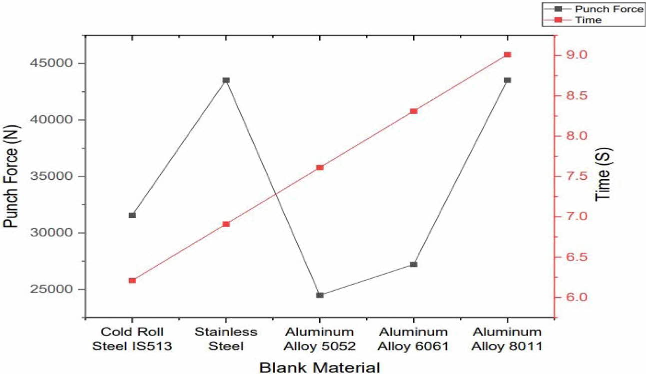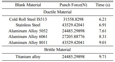 The Table 3 displays various types of blank material used during the experiment and also shows that the punch requires various forces according to the materials used. Here the punch force and time were high for Aluminum Alloy 8011 & least for Cold Roll Steel IS513.
