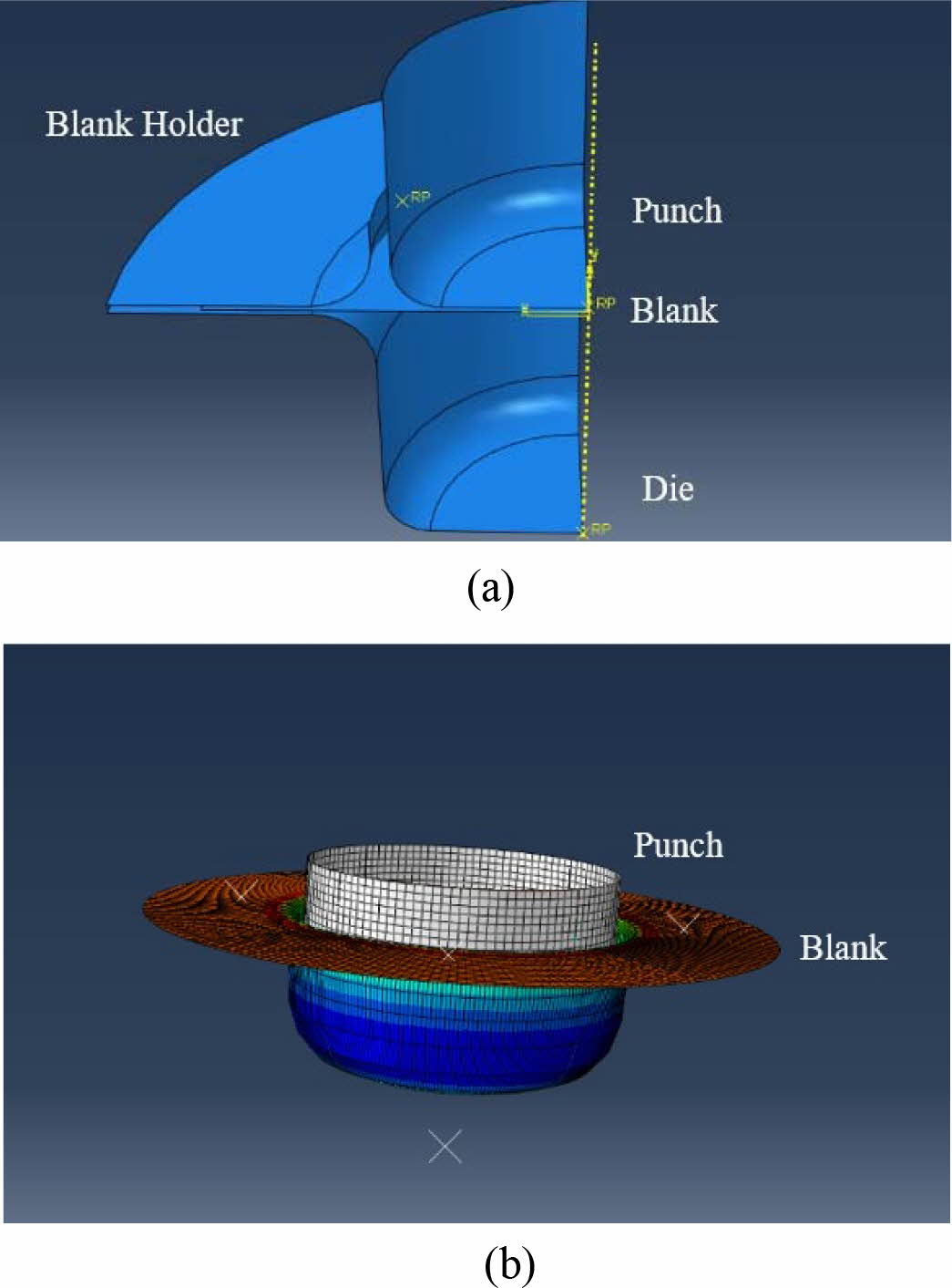 Explicit Dynamic Analysis was also carried out to predict the punching force. Stress and strain value of the blank material under deep drawing process is also studied for all the experimental cases to verify the results obtained during the experimentation. Using ABAQUS software the 3D model of the punch, blank, die and blank holder are created. Further the 3D model is assembled with the necessary constrains such that the blank material is drawn in from the edges and therefore slides in-between the holder and the holder and the die. The outer edge of the blank is clamped, inwards. This is achieved by defining the displacement to punch, that draws the blank towards the die creating the required shape. Blank holder is assigned with force to hold the blank material during the process. The contact between the punch, blank and die is induced with a friction coefficient of 0.1. Simulations are run and analyzed for different blank materials used and keeping the rest of the parameter constant. Finally, the required data obtained are presented in the form of a table, and a graph.