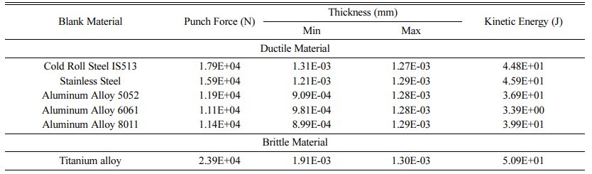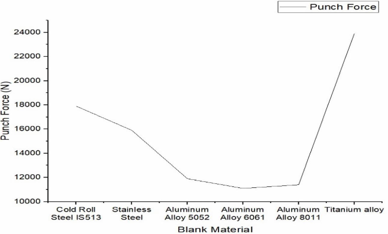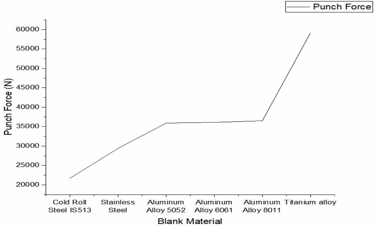 Fig. 7 shows that the aluminum alloys require mostly the same punch force on calculation as the properties are very similar to each other. Table 5 shows that there is no major difference in thickness when the material is varied. Here the punch force was maximum for Titanium Alloy and least for Cold Roll Steel IS513. The Kinetic Energy is maximum for Titanium alloy & least for Aluminum Alloy 6061.