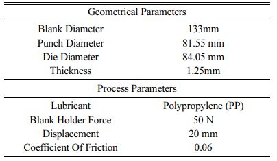 The Table 2 displays the geometrical parameters & process parameters that have been maintained constant while performing this experiment. The punch force and time required for drawing were noted respectively. When Titanium was used as blank material it was found to be a failure during the deep drawing process, cracks were developed as its brittleness property dominates during the process.