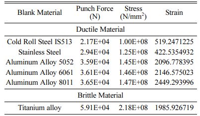 Table 4 shows that it requires various force is required for various materials and stress, and strain also varies. Here Punch force, stress & strain was high for Titanium alloy and least for Cold Roll Steel IS513.