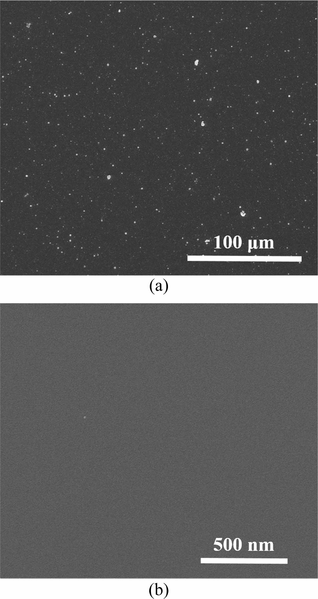 Fig. 1 Plane-view SEM images of silicon dioxide processed at (a) room temperature and (b) 400 oC, respectively. |