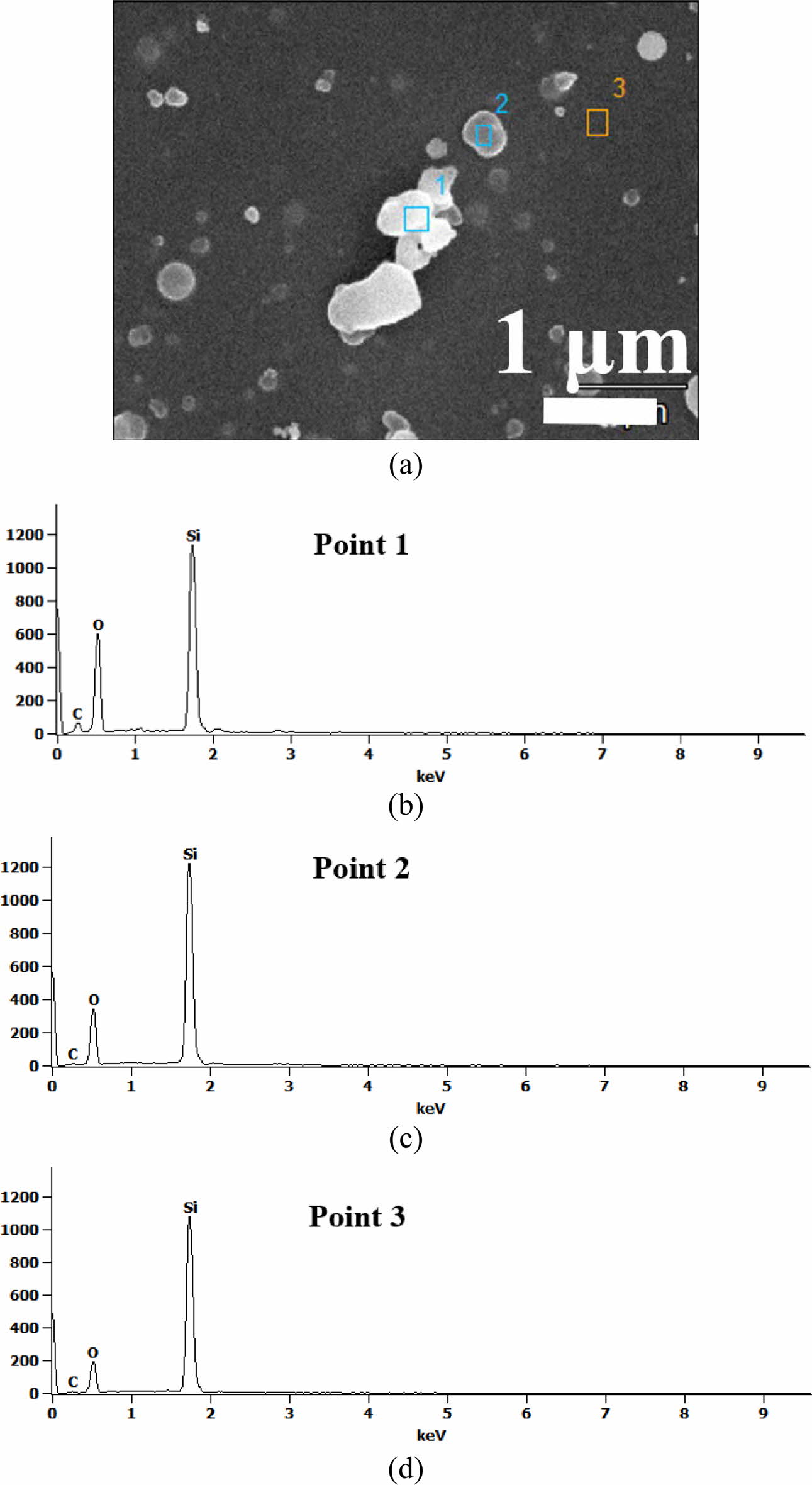 Fig. 2 (a) Image of EDS analysis of samples formed at room temperature: The spectrum of (b) point 1, (c) point 2, and (d) point 3. |