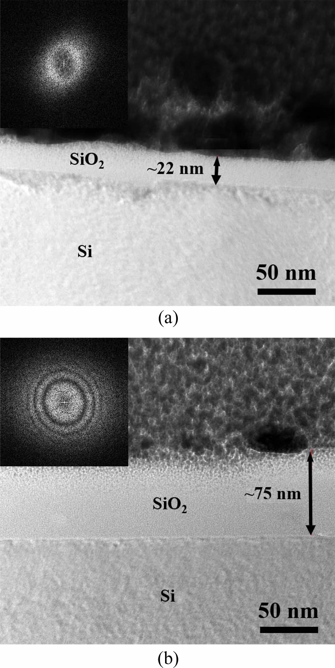 Next, we study the deposition rate according to the temperature and the shape of the inside of the thin film. Figs. 3(a) and 3(b) show the cross-sectional high resolution TEM results of silicon dioxide formed at 25 oC and 400 oC. It can be observed that an insulating layer having a thickness of ~22 nm at room temperature and ~75 nm at 400 oC was formed. The temperature difference of more than 350 oC resulted in a thickness difference of more than 3 times. In the APP equipment, if the sample stage is repeated once and again at 400 oC, a 1.9 nm SiO2 film is formed, whereas at room temp. 0.55 nm is deposited. No void or defect is observed inside the thin film from the surface of Fig. 1(b) and the TEM photograph, and these results indicate that dense SiO2 material was formed. The amorphous inorganic layer, devoid of micro-crystallites, was identified by weak and wide rings in the diffraction pattern by transmission electrons [See insets in Fig. 3]. The boundaries between the oxide material and the Si wafer were clear and a finite thickness interface was identified regardless of the temperature. Silicon and oxide are well bonded to each other, so it can be seen that oxide is an optimal insulating material for silicon semiconductors.