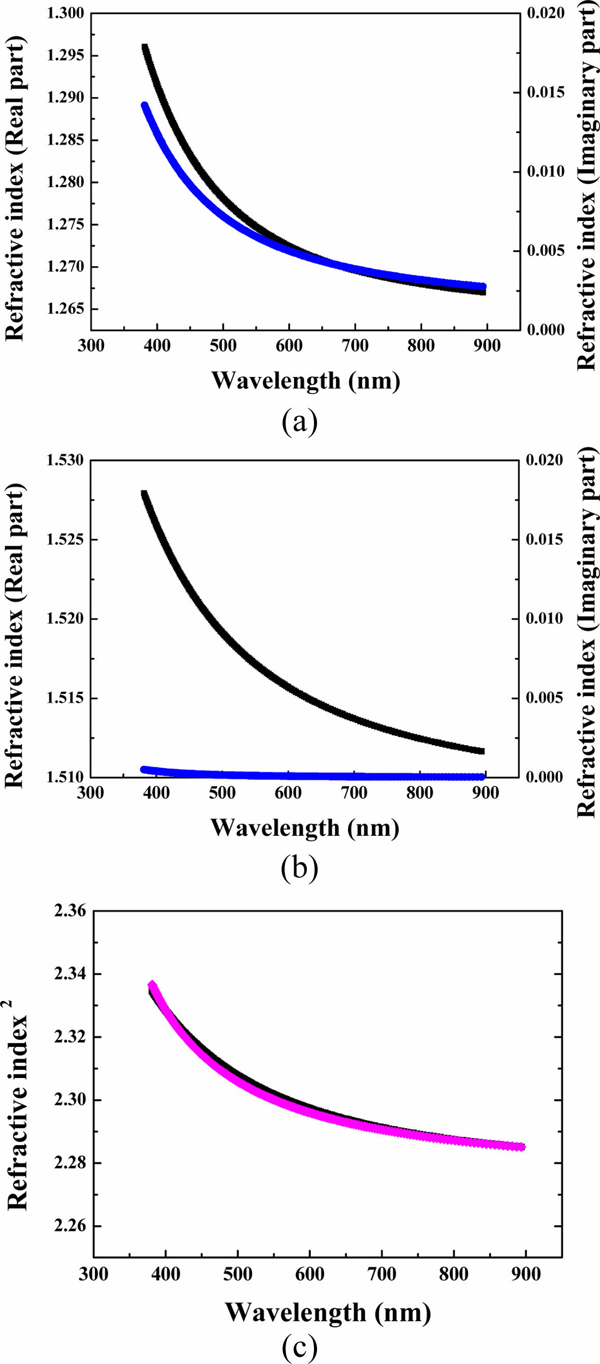 Fig. 4 Real (black) and imaginary (blue) parts of the refractive index over the measured wavelength range of silicon dioxide processed at (a) room temperature and (b) 400 oC, respectively. (c) Measured refractive index versus wavelength (black) and fitted curves (pink) to the Sellmeier's formula. |