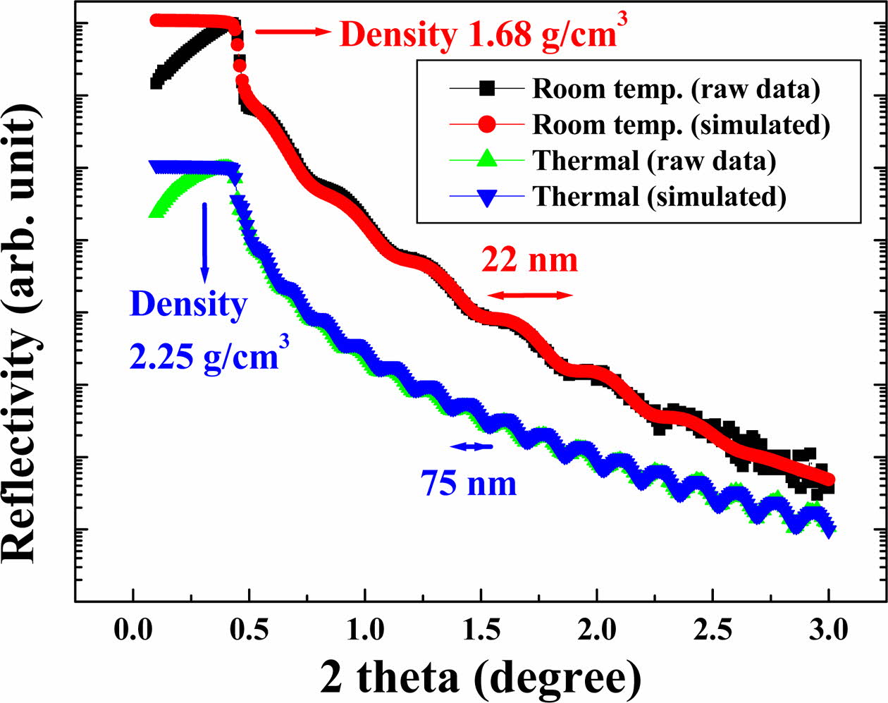 Fig. 5 Thickness and density of SiO2 thin films analyzed by simulating data (red and blue) measured (black) with XRR. |