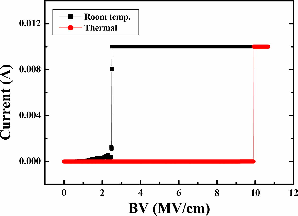 In order to evaluate the possibility of using the manufactured oxide film as a gate insulating layer of a thin film transistor or an insulating film for other uses in the semiconductor or display industry, voltage and current characteristics analysis is required. Current characteristics according to voltage were measured to verify the possibility of using the insulating layer of the electronic device, as shown in Fig. 6. The electrical breakdown of the SiO2 formed on the Si wafer can cause irreversible damage in the layer and seriously degrade the device performance [24, 25]. The breakdown field BV is expressed by the BV = Vbd/t where Vbd is the value of the breakdown voltage and t is the thickness of the SiO2, while the sharp increase in current indicates the electrical failure of the layer. As shown in the figure, SiO2 coated at room temperature showed a breakdown electrical field of 2.5 MV/cm, while oxides deposited at 400 oC showed a characteristic of 9.9 MV/cm. The thin film produced by applying heat is similar to the BV characteristics of the oxide film deposited in mass production using the thermal oxidation method or CVD method [24]. However, the low BV value at room temp. is associated with low density and refractive index values, and is also affected by the small grains formed on the surface in the SEM image. This is because the electric field is concentrated on the sharp or protruding part.