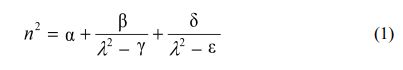 The fitted curve is also shown graphically in Fig. 4(c), indicating that it matches the measurement value well. The fitted parameters are α = 2.277, β = 0.0014, γ = 0.084, δ = 0.0048, and ε = 0.015. The sum of the squared residuals for the fitted curve is very small. This means that the expression of Sellmeier's formulation is reasonable in the range of visible spectra.