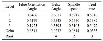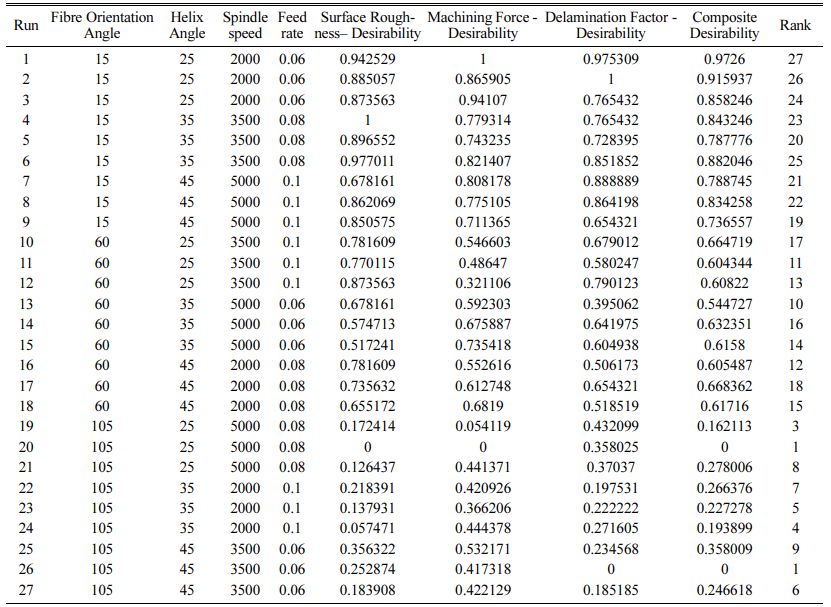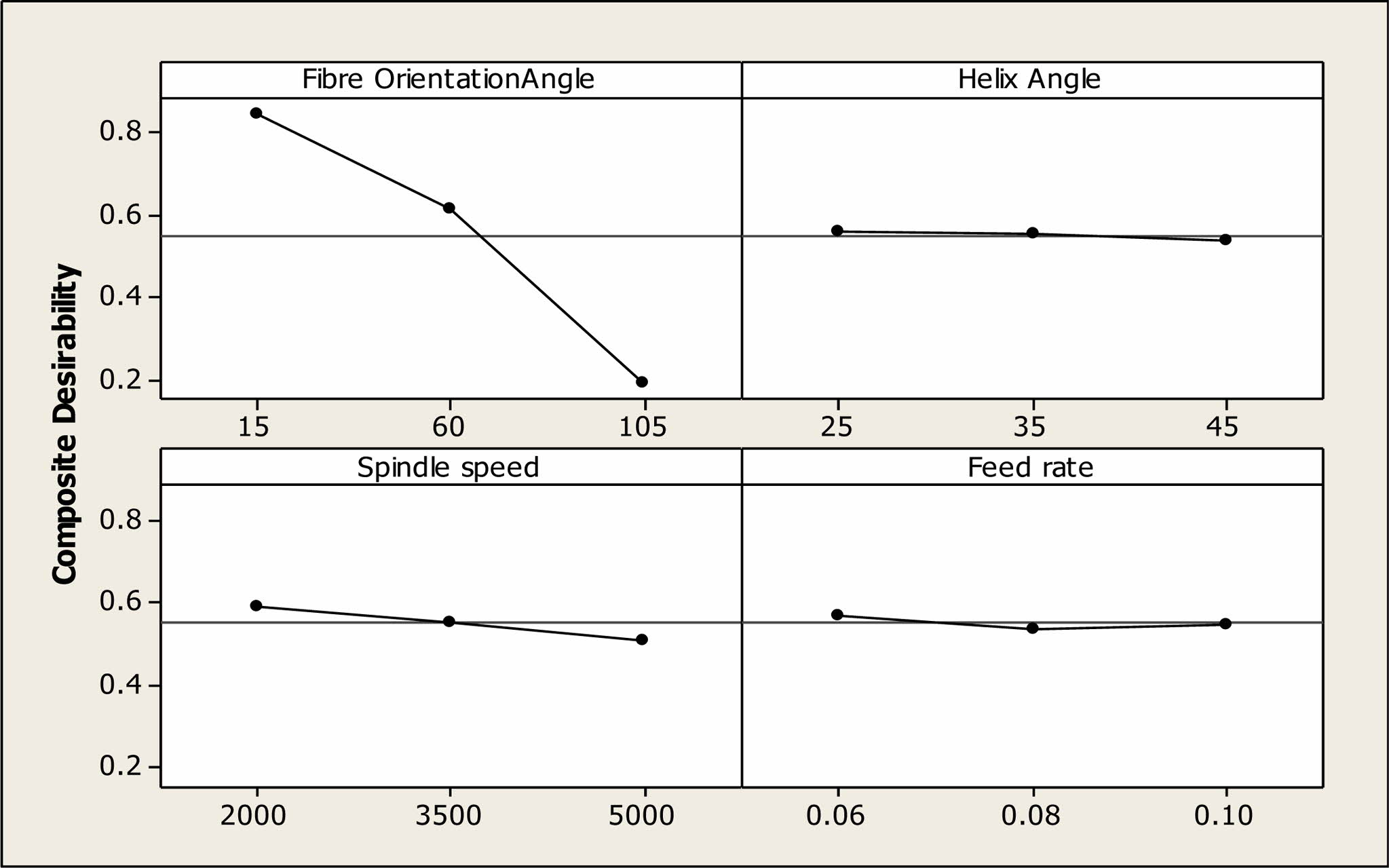 The effect of composite desirability on fibre orientation angle, helix angle, spindle speed and feed rate are shown in Fig. 3. It is observed that as the fibre orientation angle increase, the composite desirability decreases drastically. It is also observed that there is no major change in helix angle, feed rate and spindle speed with respect to the composite desirability while machining of the composite material. The ranking of the composite desirability is done in the revised manuscript. And it is observed that the combination of the process parameters; fibre orientation angle, 15 degrees, helix angle, 25 degrees, spindle speed, 2000 rpm and feed, 0.06 mm/rev provides the highest value in the ranking of composite desirability.