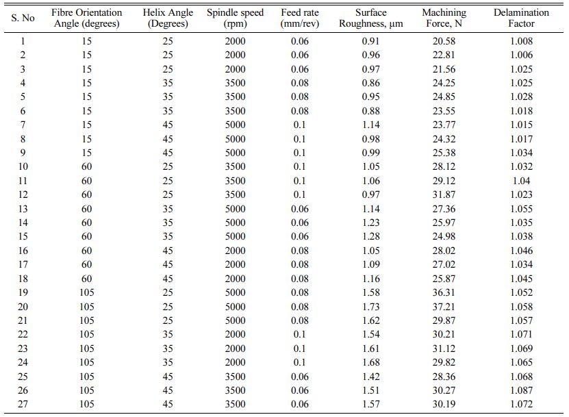 The universal testing machine is used for testing the tensile strength of the composite material and it is observed that the sample 4 with 40% glass fibre re- inforcement provides higher tensile strength when com- pared to the other samples. This composite laminate is further selected for the machinability studies in a CNC milling machine. End milling of the composite laminate is performed in the composite laminate to establish the relationship between the machining process parameters and the response. The fibre orientation of the glass fibre reinforcement, helix angle of the milling cutter, spindle speed and feed rate are considered as the process parameters in this research work. Surface roughness, machining force and Delamination factor are considered as the response. The surface roughness is evaluated using Mitutoyo Surface roughness tester. For each experiment, three reading are taken using the surface roughness tester and the averages of these three values are recorded as the final value for surface roughness. The measurement of force during milling operation is carried out using Kistler dynamometer. Machining forces are measured using the dynamometer. The machining force is combines tangential force, feed force and radial force. These three forces can be measured using digital dynamometer which is attached to the milling machine during the milling process of the laminated composites. Delamination factor is measured using a high resolution optical microscope. L27 orthogonal array is used and 27 experiments are conducted at three levels of the fibre orientation angle, helix angle, spindle speed and feed rate. The responses are measured for each experimental run and the experimental data is presented in Table 1. Table 2