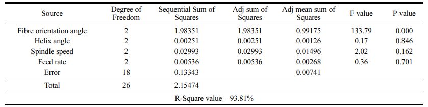 Composite desirability is calculated from the individual desirability of each process parameters. Analysis of variance (ANOVA) is carried out for the composite desirability to find the significant process parameter on the composite desirability of the composite material. The ANOVA table for composite desirability is shown in Table 3. It is observed that fibre orientation angle plays a major significant role followed by spindle speed, feed rate and helix angle. From the experimental data, ti is observed that all the values recorded for composite desirability falls with the central median line and it is highly acceptable. The response table for means for composite desirability is presented in Table 4.