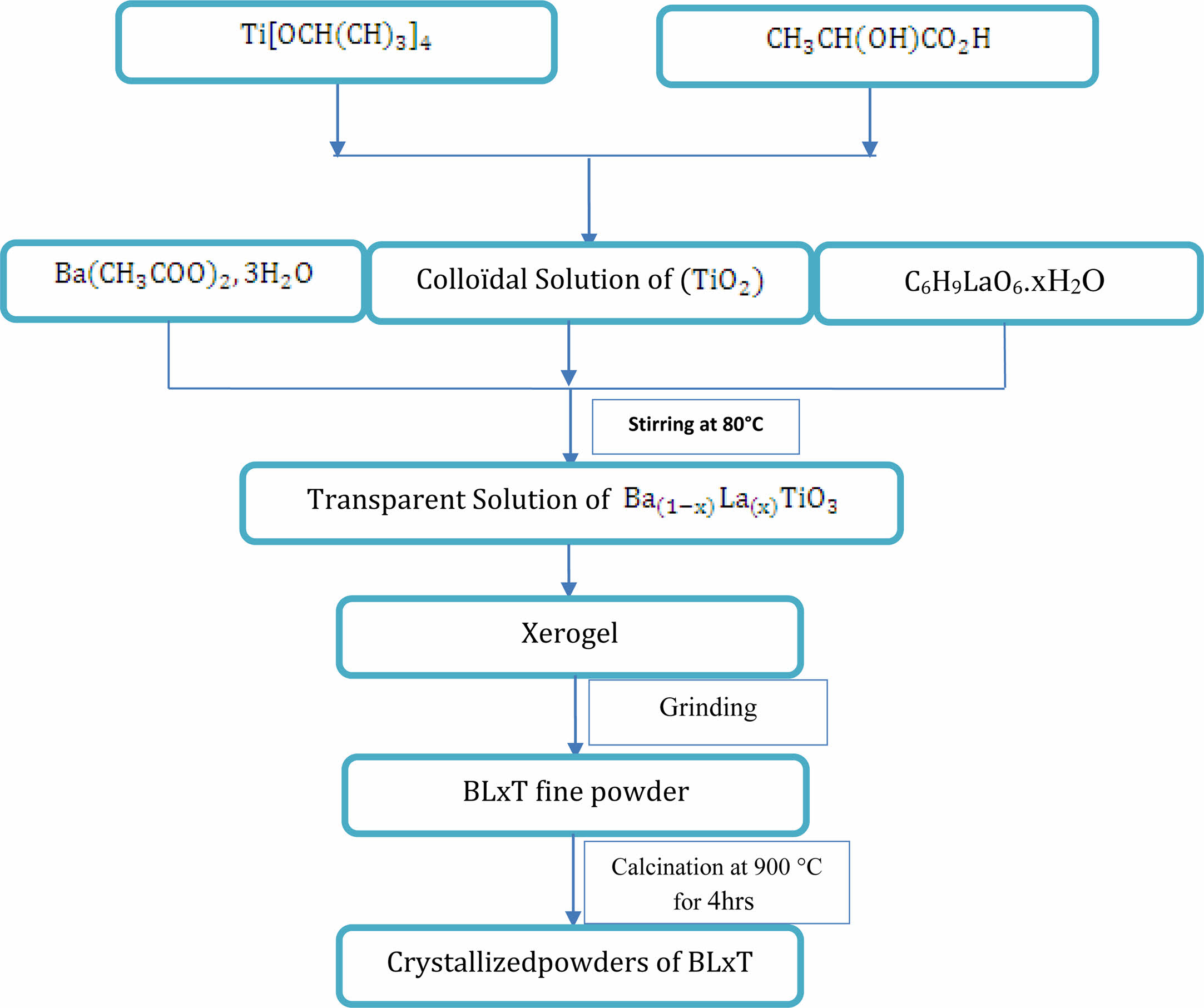 The sol-gel route was used to elaborate a series of BLaxT (x = 0, 0.25, 0.50, 0.75, 1.5 and 3%) crystalline powders [9, 16] through the destabilization of colloidal solution (DCS). The choice of this technique was based on its several advantages such as an excellent control of the stoichiometry, a good homogeneity of the powders and a crystallization of the powders at a relatively low temperature [15].