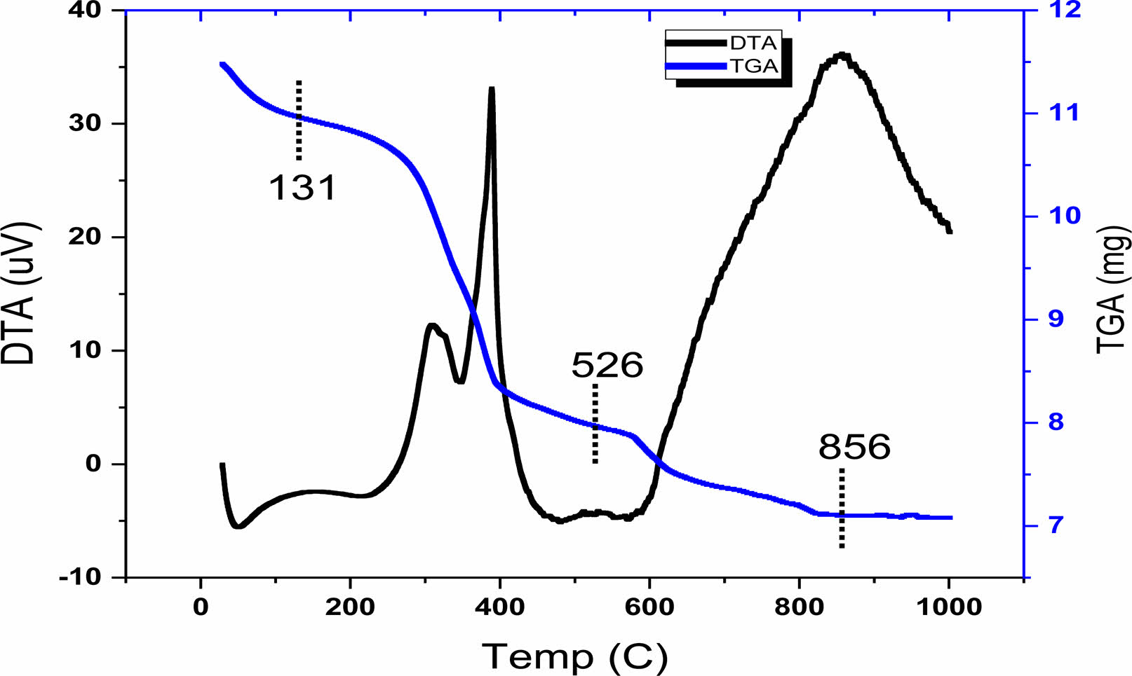 The TGA and DTA techniques were used to follow the different steps of decomposition (mass loss) of the raw powder corresponding to the sample BLa1.5T, as shown on Fig. 2. This thermal analysis of the sample was performed in air up to 1000 °C with a temperature rate of 5 °C/min which makes it possible to determine the temperature of calcination of the samples. Three steps of decomposition (mass loss), recorded in the range of 30-131; 131-526; and 526-856 °C (corresponding to an overall mass loss of approximately 35%), are displayed by The TGA curve. The first step corresponding to the interval (30-131 °C) represents a mass loss that can be attributed to the elimination of water and of excess of lactic acid [17]. This mass loss is accompanied by a small endothermic peak in the DTA curve. The progressive mass loss corresponding to the second interval of temperature (131-526 °C) is accompanied by two peaks one endothermic and the other exothermic in the DTA. This mass loss can be ascribed to the decomposition of the organic matter and the elimination of CO2 and the remaining H2O [18]; rearrangements of chemical bonds in the gel are expected in this temperature interval, and the gel is transformed into polymers [19]. The last mass loss recorded in the interval (526-856 °C) was accompanied by an endothermic peak in the DTA curve (at around 856 °C), as a consequence of the decomposition of organic polymers and the formation of inorganic substances (the formation of BLaT) [20]. A complete crystallization of the powders was achieved as no mass loss was recorded above 856 °C. As mentioned in the introduction, the sol gel process permits a heat treatment of the samples at low tempertures. Indeed, the temperature of 856 °C is relatively low compared to others reported in the literature using other techniques of elaboration [21]. Furthermore, powders with nanometric grains are thermodynamically unstable [22].As a consequence of the TGA-DTA analysis, we have adopted the temperature of 900 °C as temperature of calcination of the samples for our structural analysis.