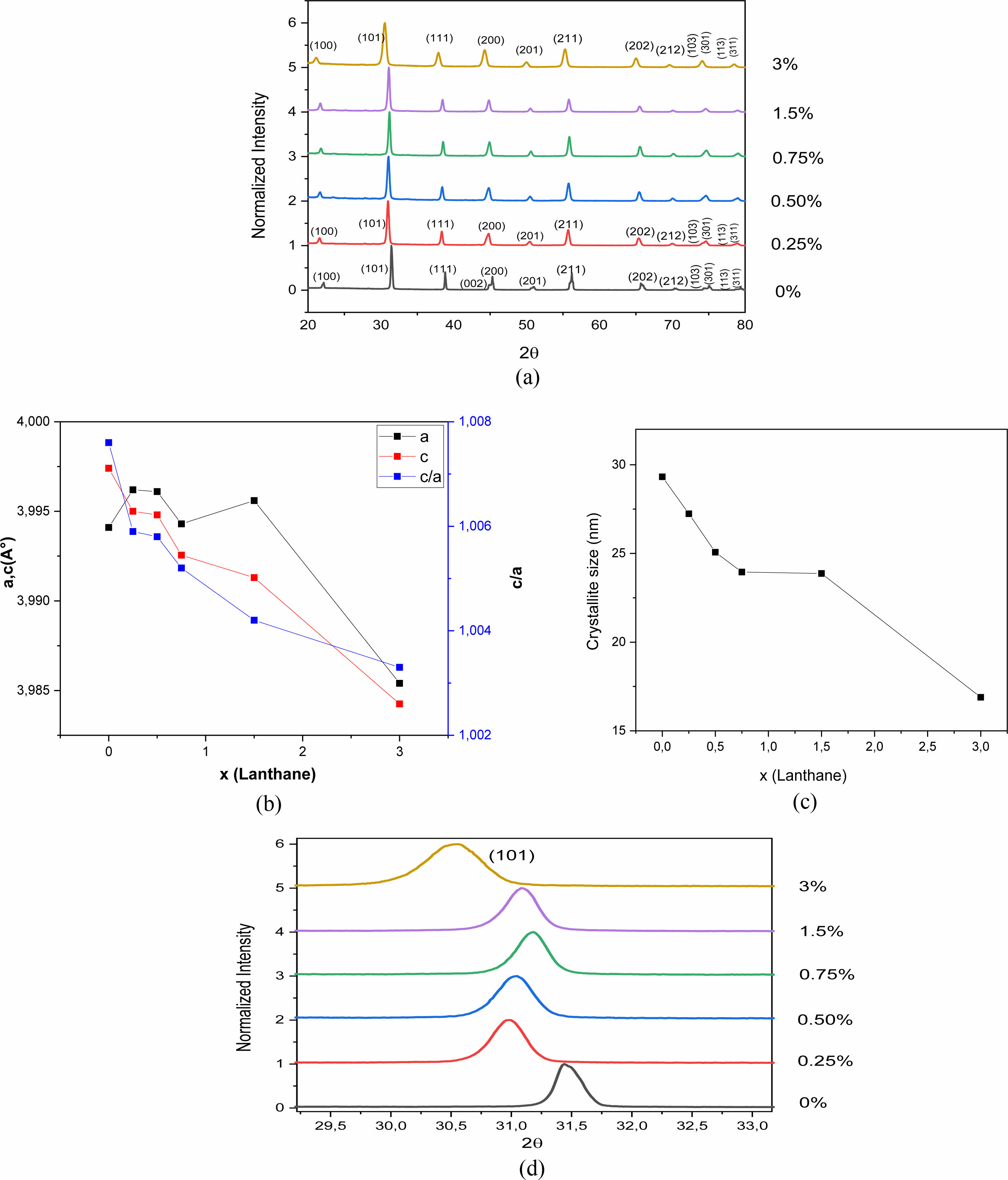 Where D is the crystallite size, λ is the X-ray wavelength (1.5406 Å), θ is the diffraction angle and β is the Full Width at Half Maximum (FWHM) of the peak (101). The estimated values for the samples are given in Table 1 and their evolution as a function of x is shown inFig. 3(c). The latter shows that when the lanthanum concentration increases the crystallite size decreases, in accordance with the evolution of the volume of the unit cell (Table 1).