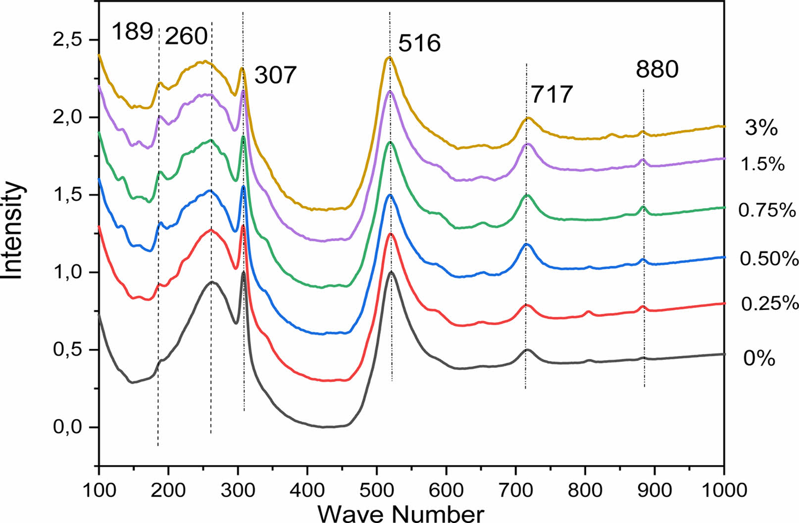 Raman spectroscopy has been used to study the expected structural phase transition in La-doped BaTiO3 samples. This technique is usefull to observe the vibration modes, rotation and other low frequencies in the system. Fig. 4 shows the Raman spectra of the Ba1-xLaxTiO3 samples recorded at room temperature as a function of the lanthanum concentration in the range of 100-1000 cm-1. It is known that in the single tetragonal crystal BT (P4mm), the Raman modes are the [A1 (TO1)] mode at 165 cm-1, the [A1 (TO2)] mode at 264 cm-1, a peak associated with [ B1, E (LO, TO)] mode at 307 cm-1, [A1(TO3)] mode at 516 cm-1 and [A1 (LO3), E (LO)] mode at 720 cm-1 [18]. Although the cubic phase theoretically does not reveal any active Raman mode, generally, Raman analysis shows broad bands around 250 and 520 cm-1, which may be caused by a local disorder associated with the position of Ti atoms [26]. In Fig. 4, most of the Raman peaks could be assigned to those of the tetragonal phase.