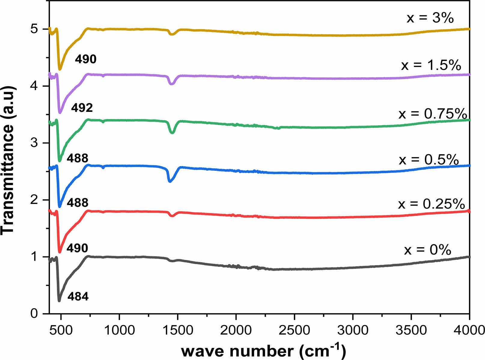 FT-IR spectra of Ba1-xLaxTiO3 powders for different La concentrations in the wavenumber range from 450 to 4000 cm-1 are displayed in Fig. 5. These spectra show two sets of absorption bands. The first one is characterized by a wide band in the low frequency range from 460 cm−1 to 730 cm−1, associated with the vibrations of the TiO6 octahedron. Moreover, all the samples show the molecular fingerprint of BaTiO3 as revealed by the Ti-O and Ti-O-Ti bonds between 460 cm-1 and 730 cm-1. The absorption peaks for the same mode of the compositions (x = 0, 0.25, 0.50, 0.75, 1.5 and 3%), were obtained at around 484, 490, 488, 488, 492 and 490 cm-1, respectively. The incorporation of Lanthanum into the BaTiO3 lattice moved the characteristic peak of Ti-O to high energy values. In our samples, the incorporation of La3+ ions into Ba2+ and Ti4+ sites influenced the binding distance betrween Ti4+ and O2- ions resulting in a high binding strength [40, 41]. In addition, the bands observed in the region from 1430 cm-1 to 1550 cm-1 could be attributed to symmetrical and antisymmetric vibrations (stretching of carboxyl groups bound to barium and / or titanium (COO−)) [42]. The results we obtained are therefore in good agreement with those of the literature [20]. The observations made on infrared spectra agree well with those revealed by XRD and Raman analyses.