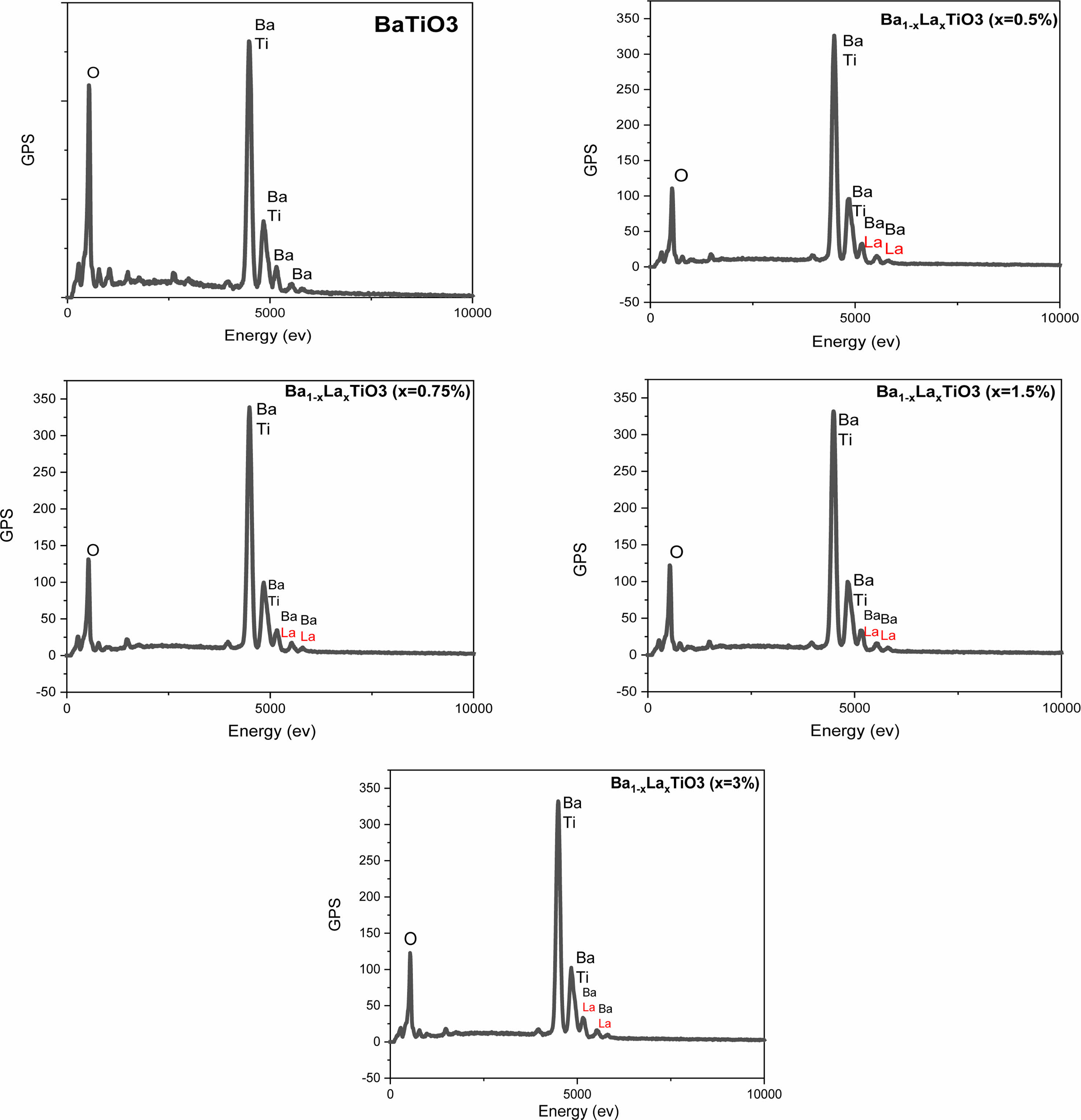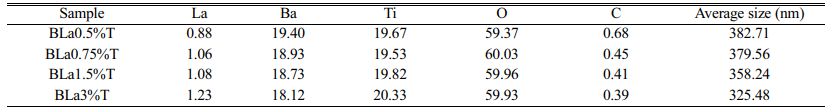 Table 2 Percentage of chemical elements obtained by energy dispersive spectroscopy (EDS) and grain size of La-doped BaTiO3. |