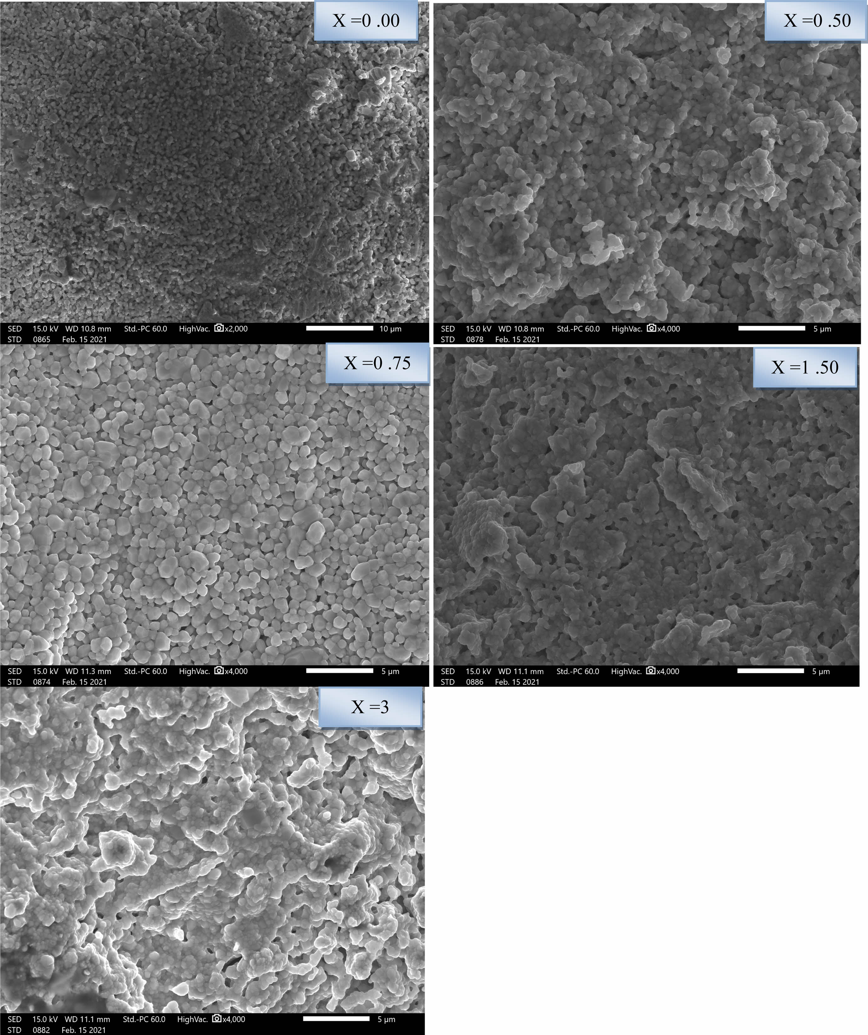 The average grain size of the particules decreased under doping from around 433 nm (pure sample) to around 325 nm (sample with 3%) (Table 2). It can be noticed that the above recorded values relative to the sintered pellets are higher than those of the crystallite sizes of the calcined powders due to the sintering process which enhance the mechanical resistance of the samples and reduces the porosity within these samples giving rise to a consolidation of the particules and consequently their size.
