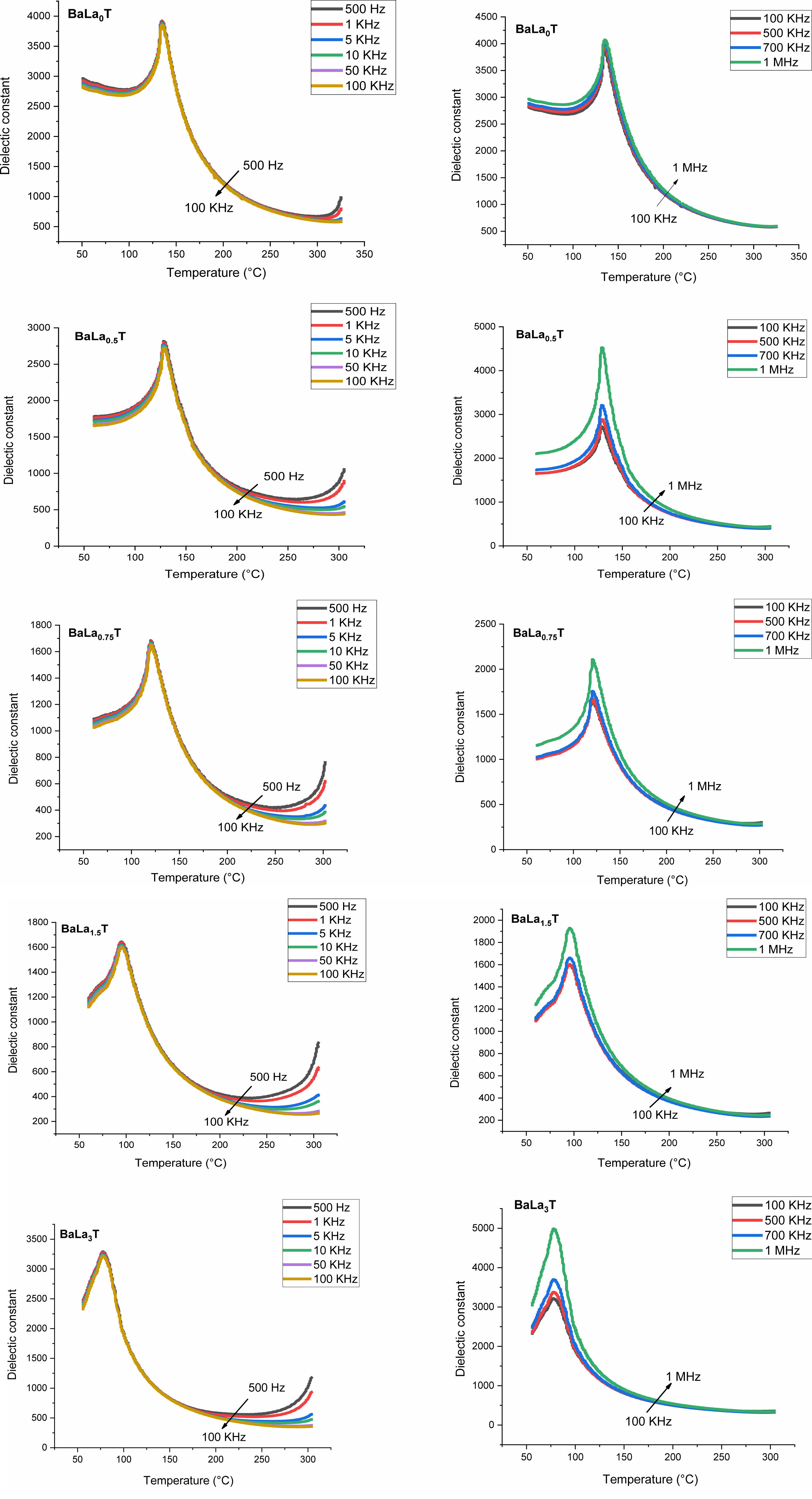 The pure BT sample behaves as a classical ferroelectric (Fig. 8) with a sharp peak corresponding to the ferro-paraelectric transition, with the Curie temperature Tc = 135 °C; when the temperature increases, the relative permittivity increases to its maximum value, εmax, corresponding to the Curie temperature Tc, which is frequency independent and at which the crystal symmetry of the sample changes from the tetragonal (ferroelectric phase) stucture to the cubic one (paraelectric phase).