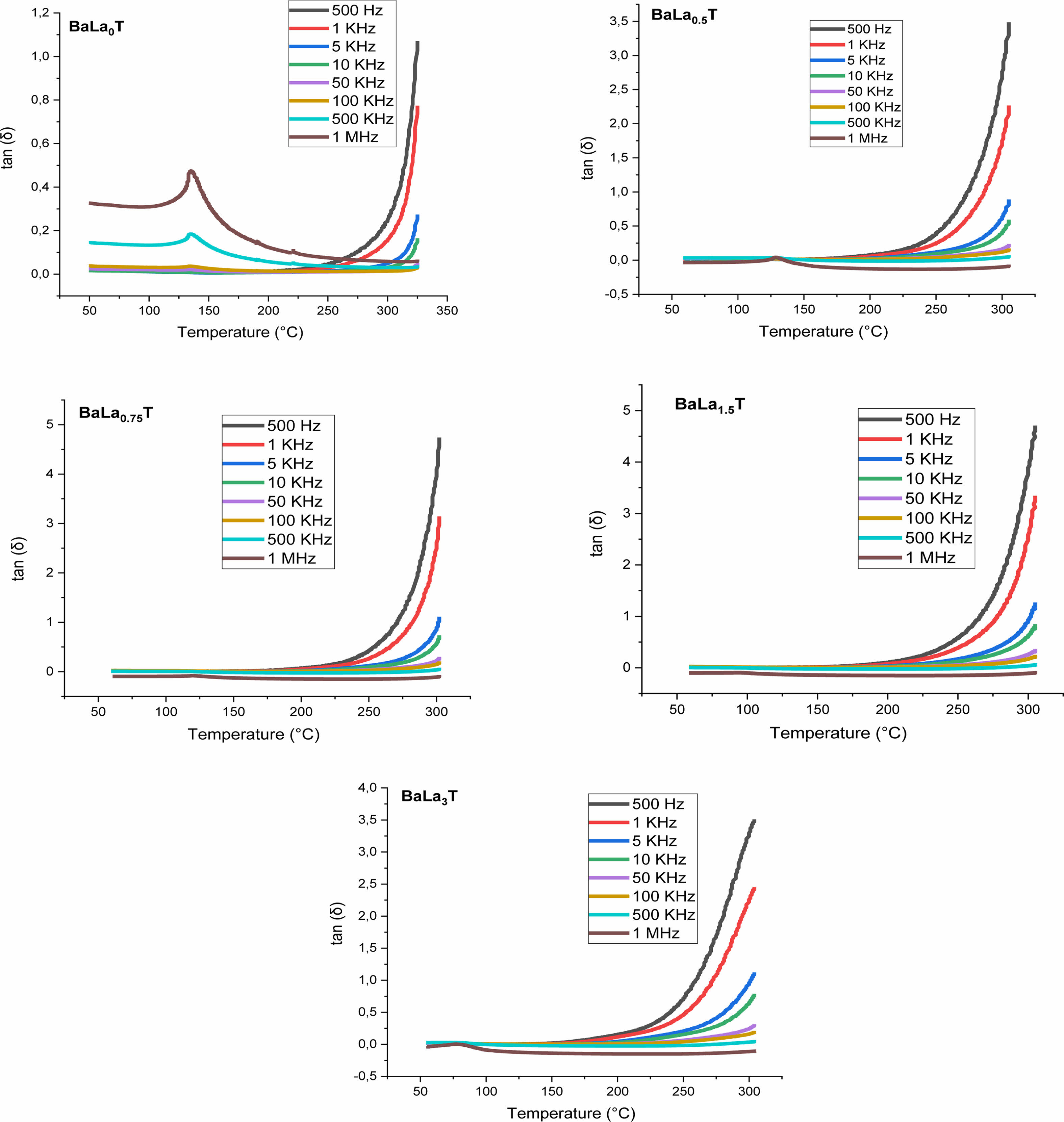 Moreover, we observed that with increasing the frequency the maximum of the permittivity (εrmax) at the FPT decreases first until the frequency f0 = 100 kHz and then increases for the frequencies superior to f0, indicating that the samples approach their resonance frequency (fr), phenomenon that in our knowledge has not been reported in La doped BaTiO3 compounds. The resonance frequency may be of a mechanical nature. In fact, these resonances are expected at very high frequencies, however the disorder consecutive to doping decreases fr as revealed by the present work. Fig. 9 displays the variations of tan(δ). It is observed that doping with La reduced strongly losses around the FPT. The increase of tan(δ) above the FPT is a normal behavior as the samples acquire a conductor character (paraelectric phase).