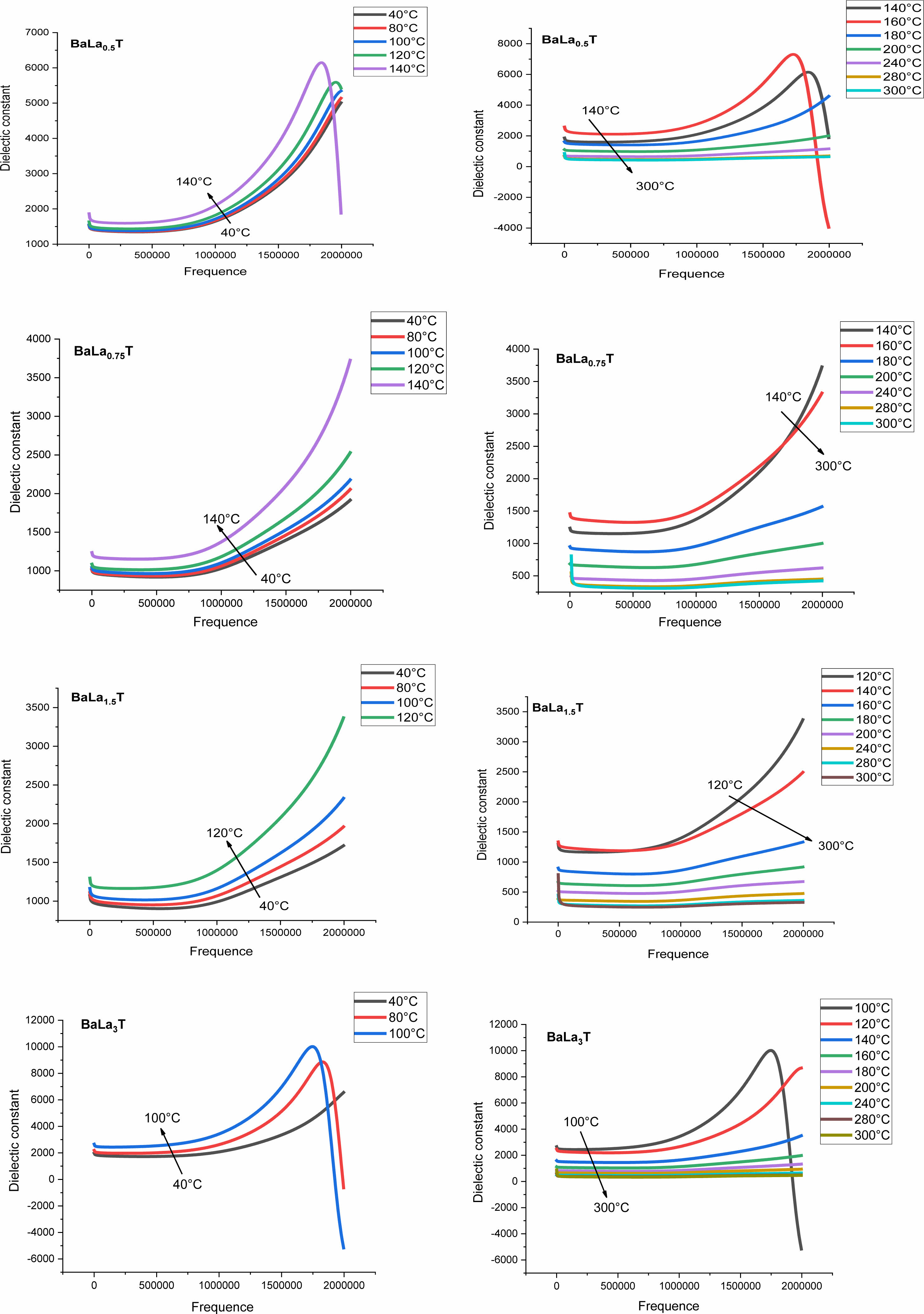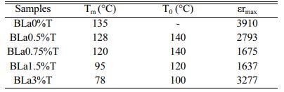 The incorporation of La into the BT matrix resulted in a decrease of the Curie temperature from 135 °C (pure sample) to 78 °C (sample with x = 3%), and that a weak diffuse character took place from the concentration x = 0.75%. We also noticed that with increasing x the maximum value of the permittivity at the ferro-to- paraelectric transition (FPT) (at the temperature Tm), εmax, decreases first until x = 1.5% and then increases (Table 3); as a comparison, the values of the permittivity recorded in the present work are higher than those reported by Andreea Vasilescu et al. who prepared Ba1-xLaxTiO3 samples (0 ≤ x ≤ 8%) with the help of the sol-gel process (εrmax = 900 for the undoped sample, εrmax = 1450 for x = 8%) [43].