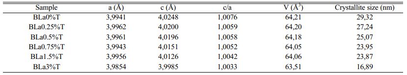 The crystallite size (D) of the obtained BLaxT samples was calculated from the X-ray diffraction patterns according to the peak (101) using the Debye-Scherrer formula [25]: