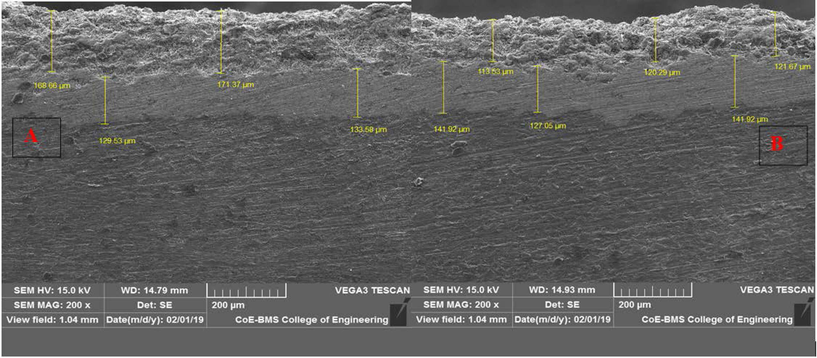 A Thermal cycling test is executed in an incinerator. In this experiment, the sample is heated in an incinerator and then quenched in a cold environment. In this study, the coated specimen was taken for a thermal cycling test with dimensions of length 15 mm, width 10 mm and thickness 5 mm. The samples are heated to 800 °C and maintained for about 5 minutes. After that, the specimen is quenched to room temperature by dipping in water maintained at 25 °C. In this study, the tests were performed after 60 cycles. During experimentation, the samples are inspected carefully to check spallation every 15 cycles.
