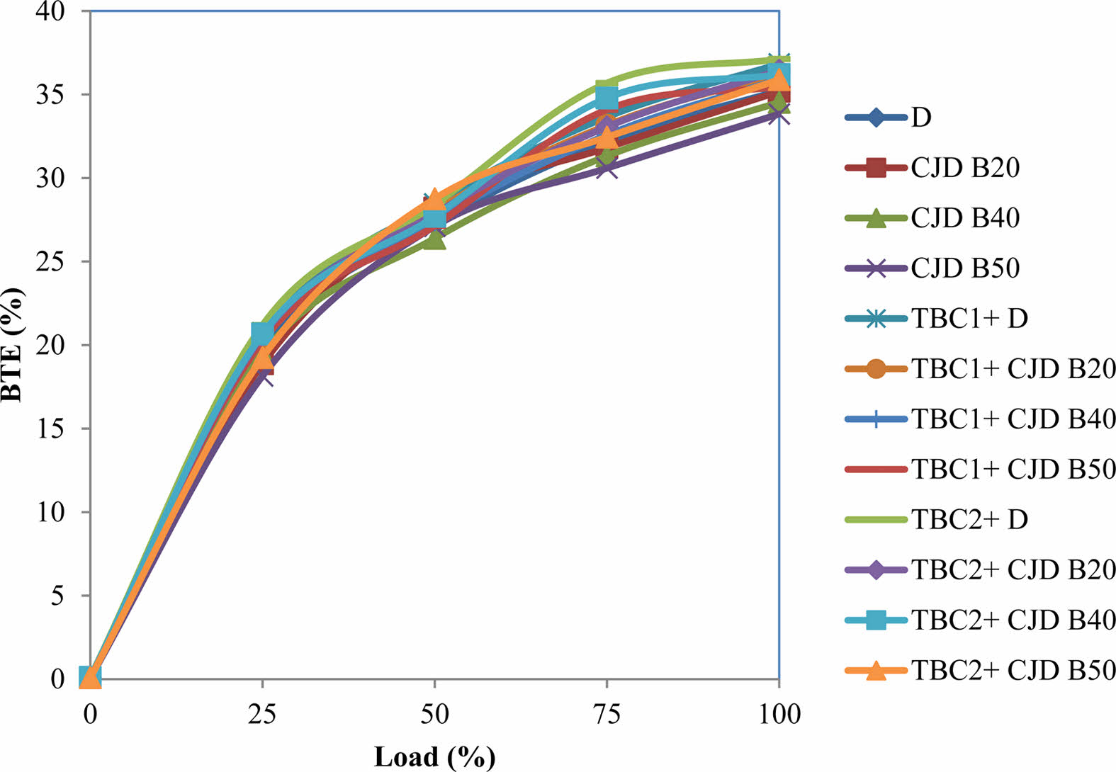 The values of BTE of the ternary blends with coated and uncoated engines are illustrated in Fig. 6. The BTE of the ternary blend fuel and pure diesel at maximum load is 35.23%, 35.18%, 34.53%, 33.83%, 36.83%, 36.28%, 35.91%, 35.468%, 37.12%, 36.449%, 36.19% and 35.88% for neat diesel, CJD B20, CJD B40, CJD B50, TBC1+D, TBC1+CJD B20, TBC1+ CJD B40, TBC1+CJD B50, TBC2+D, TBC2+CJD B20, TBC2+CJD B40 and TBC2+CJD B50 respectively. The maximum BTE value was recorded for pure diesel operated with a TBC2 coated engine, while the minimum BTE value was recorded for 50% blended fuel operated with a conventional engine. At all loads, the TBC coated engines have higher BTE than conventional engines. Comparing to diesel operated in conventional engine, the maximum improvement of 2.92% and 3.38% BTE is recorded with 20% blend operated in TBC1 and TBC2 engine respectively. The increase in BTE is generally aided by the reduction in fuel consumption for delivering equal output power. The coating layer in the piston and valves has the effect of causing a high pressure ratio [29]. The slight increase in pressure ratio improved the braking power of the engine. In agreement with Das et al. [37] the increment in BTE of a coated engine with respect to increased load is due to an improved pre-thermal reaction, which progresses the flame velocity and leads to complete combustion. When the load is increased, more fuel is supplied and more heat is produced. The coating in the piston preserves the generated heat and converts it into useful work, which increases the brake power. The BTE of the engine operated with biodiesel is very low. In particular, the engine operated with CJD B40 and CJD B50 showed very lower BTE of 34.53% and 33.83%, respectively. The decreased BTE is due to lower calorific value and higher fuel consumption compared to other blended fuels [38].