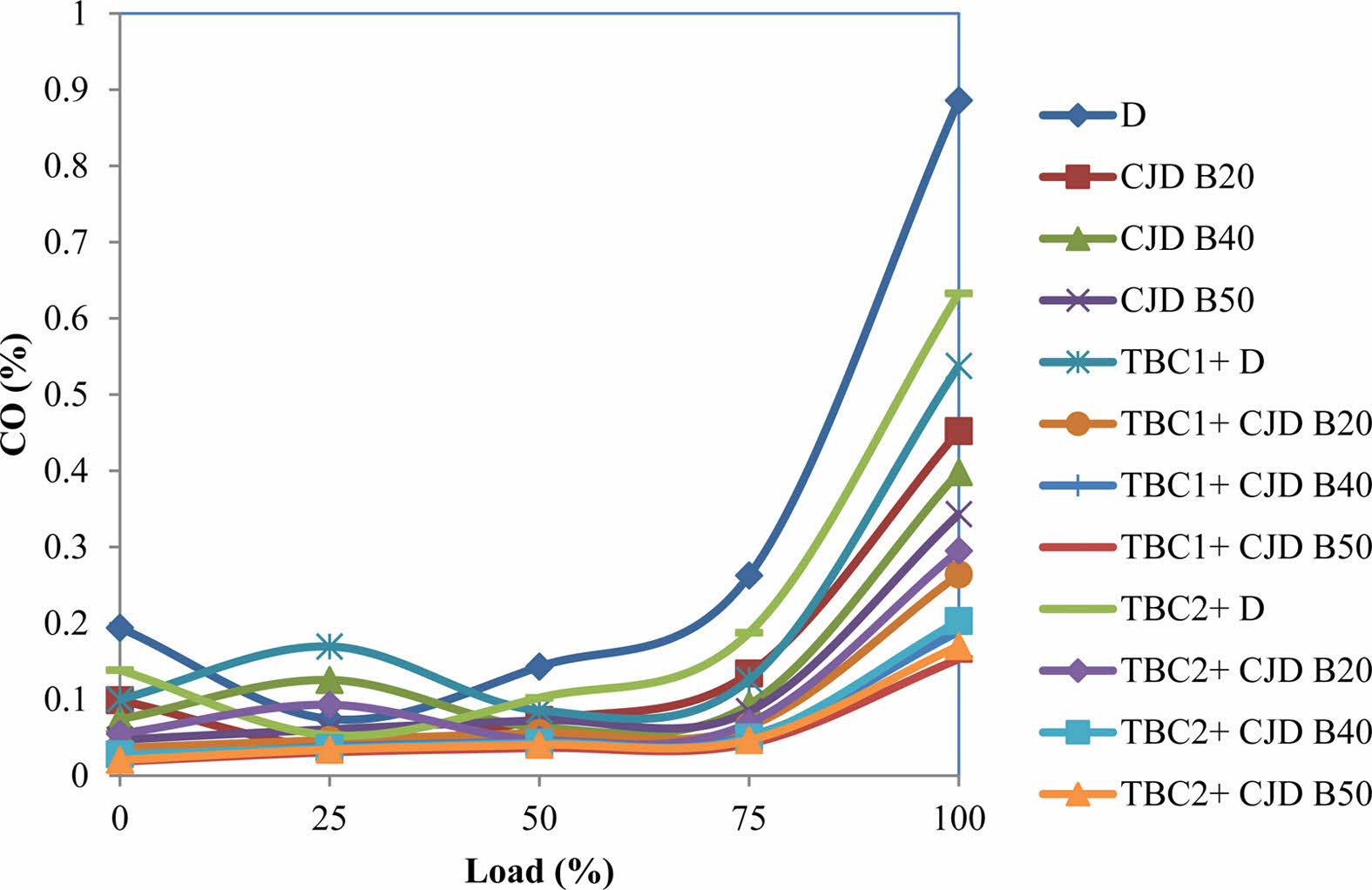 Fig. 8 shows CO emissions with respect to applied load for all twelve operating conditions. From the figure it is clearly identified that CO percentage emissions increase for increased loads. The formation of CO at lower load for all cases is slightly the same, but the emission increases as load increases rapidly. The maximum CO production is observed with neat diesel operated in a conventional engine. The formation of CO is reduced when biodiesel is used. At the same time, when compared to conventional engines, the CO emissions decreased for all fuel blends operated in coated engines. Generally, incomplete combustion generates more CO [41]. The complete combustion due to adequate oxidants in the 50% ternary fuel produces lower CO than neat diesel and lower blends in all engines. At 100% load, neat diesel produces 0.885% of CO emissions whereas TBC1+CJD B50 produces lower level of 0.153% CO. Almost 82.7% of CO emissions were reduced by 50% ternary blend fuel used in the TBC1 coated engine. The abridged pre-mixed combustion in the coated engines reduced CO formation at the initial stage and the higher cylinder temperature during diffusion combustion speed up the oxidation of CO [37]. From the experimental results, as compared to conventional engines operated with neat diesel, CJD B20, CJD B40, CJD B50 fuels, TBC1 engine emits 39.32%, 41.81%, 52.51% and 55.39% lower CO and the TBC2 engine emits 28.59%, 34.73%, 48.99% and 50.44% lower CO.