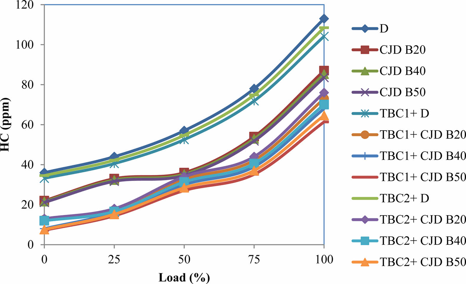 The emission of HC in ternary fuel and neat diesel operated in the engines is depicted in Fig. 9. The readings were taken with increased engine loads. From the experimental results, it can be understood that at 100% load conditions, a considerable reduction in HC emissions was recorded for all tested fuels operated in TBC engines. Comparing to conventional engine, CJD B20, CJD B40, CJD B50 fuels TBC1 engine emits 7.84%, 16.14%, 20.24% and 26.55% lower HC and TBC2 engine emits 4.0%, 12.64%, 17.85% and 22.68% lower HC. The lower emission of HC for biodiesel in coated engines may be due to increased combustion temperature caused by lower heat rejection to the exhaust systems [19]. It is also attributable to a reduction in heat losses to the engine cooling water and an increase in the after-combustion temperature [42]. The results clearly show that the ceramic coating on the engine enhances the combustion characteristics of the engine, including mixture ratio and oxygen amount. At higher loads, the differences in HC emissions are observable. But at lower loads, the changes are not ample. The supply of fuel and net heat produced inside the cylinder is low, which is not enough to achieve complete combustion.