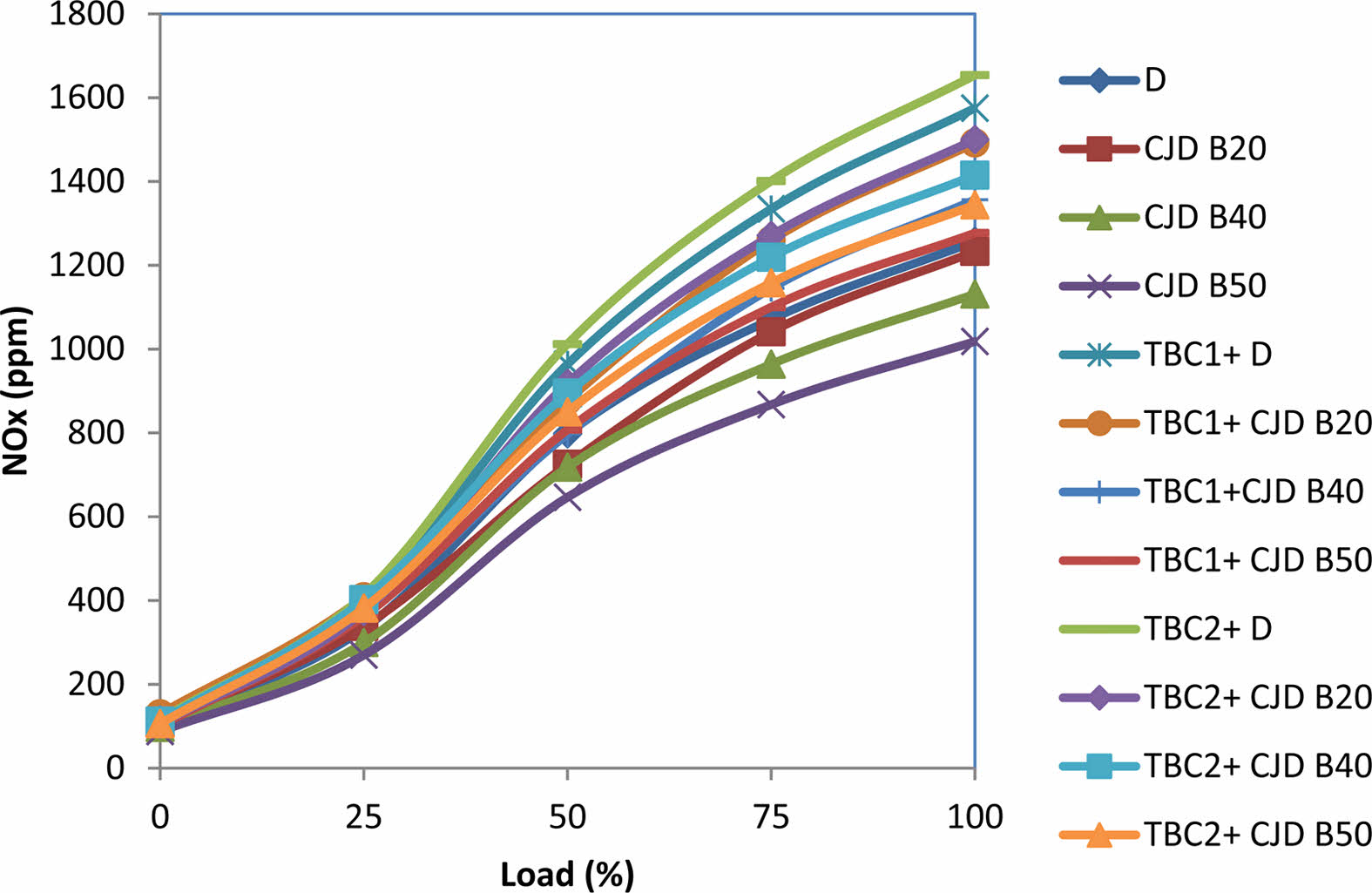 The effect of NOx concentration on coated and non-coated engines operated with different tested fuels is depicted in Fig. 10. Initially, lower NOx emissions are observed for all engines, though at higher loads, the engine emits maximum NOx. When diesel is used as a working fuel, the increase of NOx is 25.3% and 31.56% for TBC1 and TBC2 engines respectively compared to conventional engines. The main reason for the increased NOx production is the higher combustion chamber temperature [8]. Consistent with the Zeldovich mechanism, during combustion, the OH radicals are produced and react with nitrogen atoms to formulate further NOx [43]. At 100% load, the value of NOx for neat diesel, CJD B20, CJD B40, CJD B50, TBC1+D, TBC1+CJD B20, TBC1+CJD B40, TBC1+CJD B50, TBC2+D, TBC2+CJD B20, TBC2+CJD B40 and TBC2+CJD B50 are 1257 ppm, 1233 ppm, 1131.3 ppm, 1018.17 ppm, 1575 ppm, 1491.93 ppm, 1356.3 ppm, 1277.03 ppm, 1653.75 ppm, 1500 ppm, 1415 ppm and 1344.25 ppm respectively. These results are also consistent with previous research findings [44, 45]. More than 90% of NOx produced in a conventional engine comes as NO, with the remaining 10% consisting of NO2, NO3 and NO4. When coated engines are used, the formation of NO is reduced by 60%. In general, it can be concluded that, in TBC engines, the percentage of harmful NO was lowered with increased NOx level.