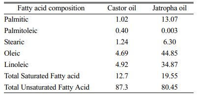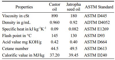 Ricinus communis (castor seed) and jatropha seed oil used for this study were obtained from the cold press method. The collected oil is then converted into biodiesel through a transesterification process. Prior to the conversion, the oil was tested for its physical characterization and fatty acid composition. The physical characteristics and fatty acid profile of the oils are given in the Table 1 and 2. Here, the physical analysis of the castor and jatropha seed oils was performed by following the ASTM standards mentioned in the Table 1.