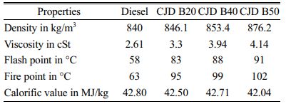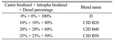 Castor and jatropha oils have higher fatty acid contents. The selected jatropha oil has a low viscosity, cheap and available in plenty when compared to castor oil. Blending these biodiesels with diesel provides a noble economic feasibility. In this study, the prepared ternary biodiesel blends shown in the table were prepared and utilized for engine analysis. All prepared fuels were tested in the engine at different loading conditions of 0%, 25%, 50%, 75% and 100%. Table 3 shows the prepared ternary blends and Table 4 shows their properties.