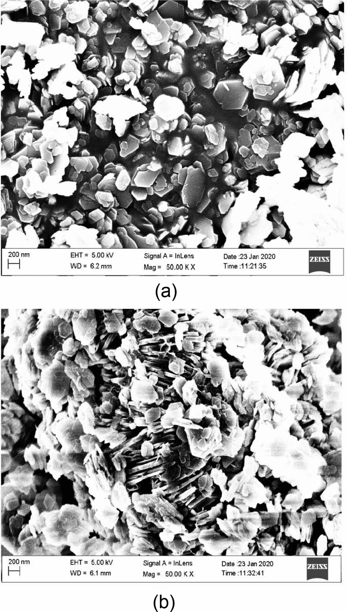 The SEM images of the catalysts synthesized at different temperatures are presented. The sample synthesized at low temperature (100 ℃) and shorter duration (24 hours) indicated more uniform cluster formations, as shown in Fig. 1(a). The cluster showed formation of hexagonal structures, which could be hexagonal cages. On the other hand, the sample synthesized at 150 ℃ and 48 hours showed larger and smaller hexagonal clusters with random orientations. This is shown in Fig. 1(b). Therefore, it is evident that the uniformity of clusters formed is disturbed by excess heating.
