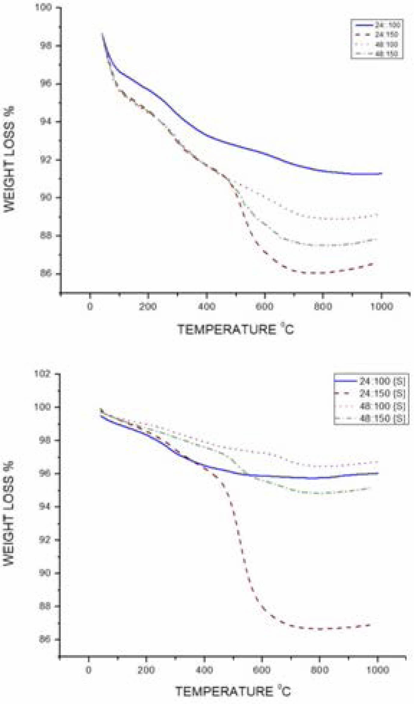 The thermal stability of raw catalyst and support catalyst is determined by TGA by TA instruments in the temperature range of 1100 °C. Nitrogen is used as a purge gas. 2 grams of sample is taken and nitrogen is purged into the chamber from room temperature. Fig. 3 shows the percentage weight loss of kaolin while increase the temperature up to 1000 °C. The graph indicates the weight loss from 40 °C to 200 °C, the water present in both raw and support catalyst is vaporized. There is a drop in weight loss at 500 °C is due to the removal water content at which replace the Alumina during dealumination. At higher temperature the 24 hours and 100 °C sample in both support and raw catalyst shows minimum amount of weight loss. In support catalyst, all the four catalyst drops nearly 2-5% loss. The prepared clay based zeolite can with stand up to 500 °C and its support withstand for 600 °C.