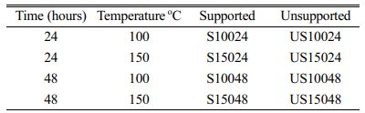 Cage type catalysts were prepared by hydrothermal method using an Stainless steel autoclave provided with a Teflon vessel. The technique is chosen as it is capable of giving out hierarchial structures similar to zeolites [23]. Hydrothermal synthesis is carried out in Teflon lined stainless steel reactor at temperatures of 100 °C and 150 °C for times of 24 and 48 hour. Kaolin calcined at 300 °C for 3 hours is mixed with template at a ratio of 2:1. The resultant slurry is fed into the Teflon vessel and the vessel is sealed in the stainless hydrothermal reactor. The reactor is heated to the required temperature in a muffle furnace for the stipulated time span. The catalyst slurry is withdrew from the reactor, dried at 100 °C and calcined. The support with catalyst is dried for 6 hours to remove the water at 100 °C and calcined for 2 hours at 500 °C. The synthesized catalysts were named according to the time and temperature of synthesis as shown in the table below.