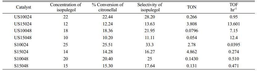 Table 3 Turn over frequency of raw and supported catalyst with its selectivity over cyclization of citronellal. |