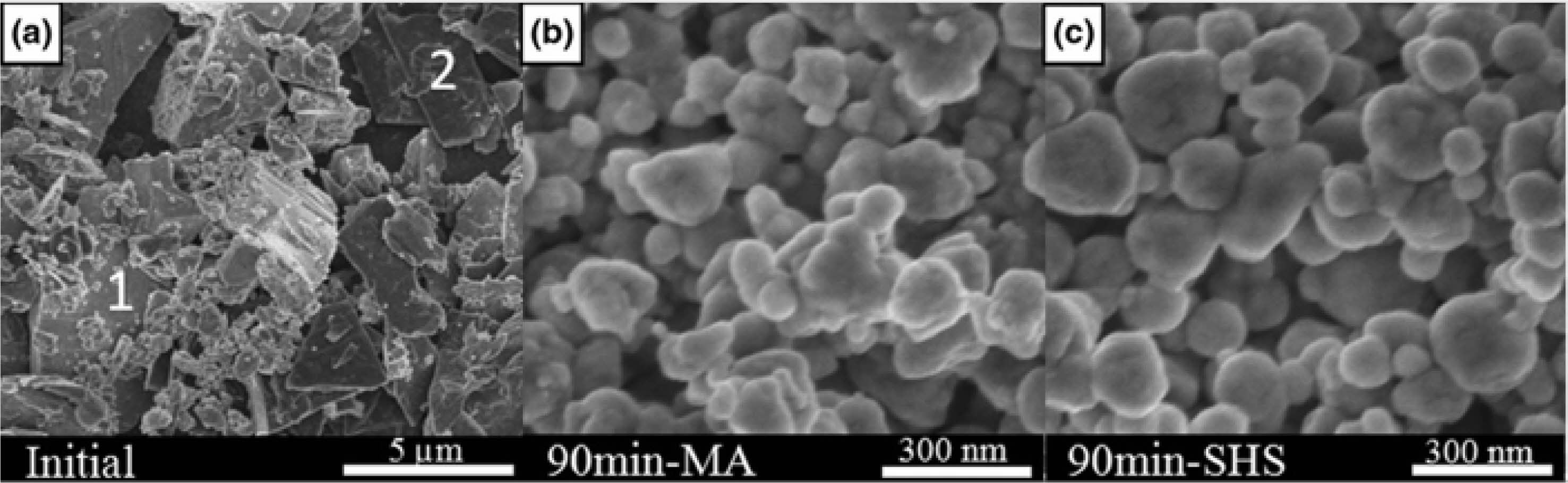 If the reactivity of the product is too high, agglomeration will inevitably occur. Tabrizi et al. [45] used a mechanochemical combustion method to synthesize vanadium boride nano-powder in a high-energy ball mill. The grinding time was 100 min, and vanadium boride could be generated without further heating. The results show that the obtained vanadium boride agglomerates are composed of nano-scale initial particles with an average diameter of 36 nm. Takeshi et al. [46] used the powder mixture with Zr:B:C = 1:1:1 molar ratio to grind by planetary mill, spontaneous combustion, and high-temperature synthesis of ZrC and ZrB2 occurred at the same time (Fig. 10). The results show that the high reactivity of disordered carbon formed by mechanical activation of graphite plays a decisive role. The product has obtained fine and uniform microstructure through MA-SHS in atmospheric environment, and is expected to become the precursor of ZrC-ZrB2 composite.