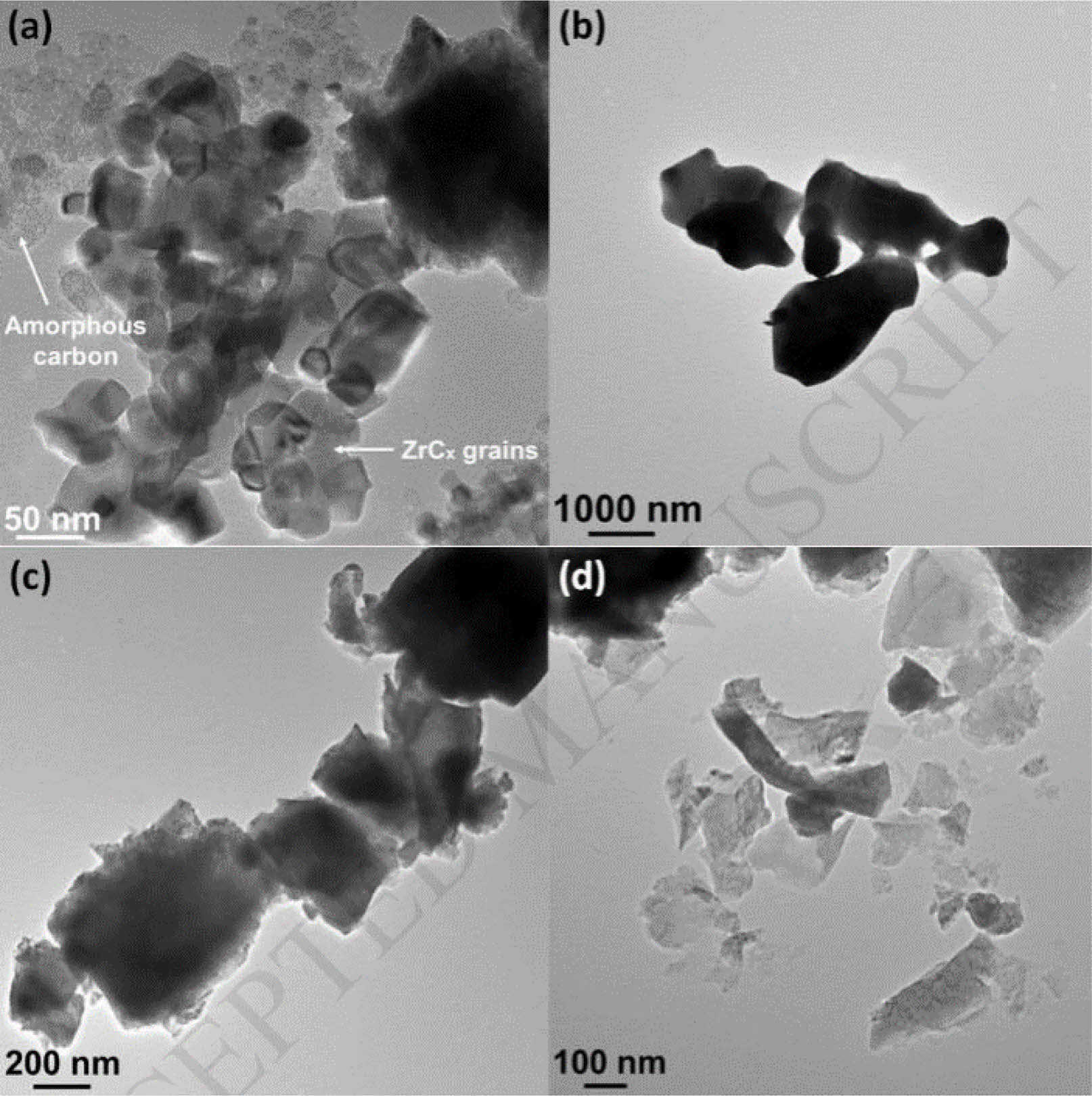 Fig. 3 TEM micrographs for ZrCx powders synthesized using starting ZrH2:C ratios of: (a) 1:0.98 after heating to 1300 ℃, (b) 1:0.98 after heating to 2000 ℃, (c) 1:0.60 after heating to 1300 ℃, (d) 1:0.60 after heating to 2000 ℃ [31]. |