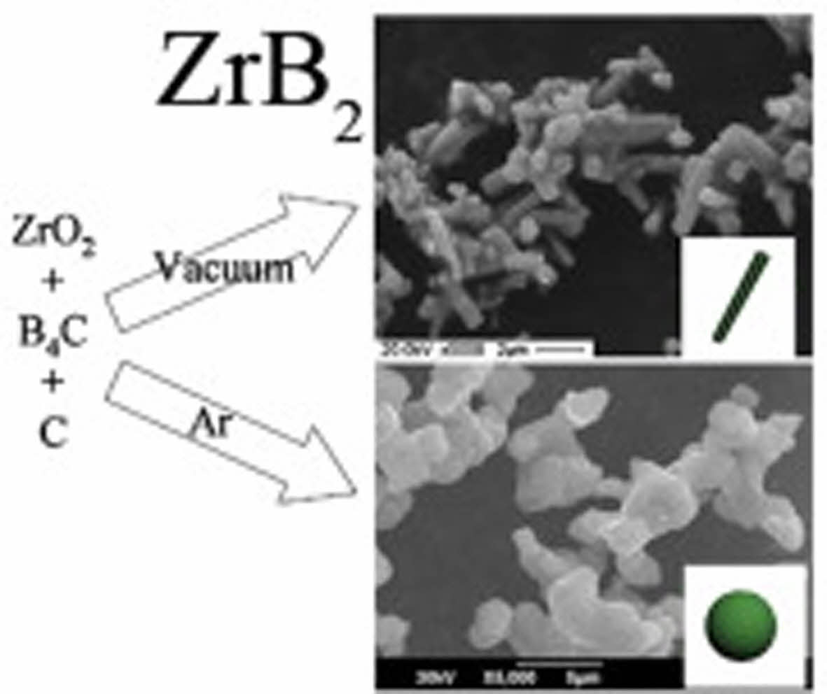 Fig. 4 ZrB2 powders prepared by boro/carbothermal reduction of ZrO2 under the different reaction atmosphere [32]. |