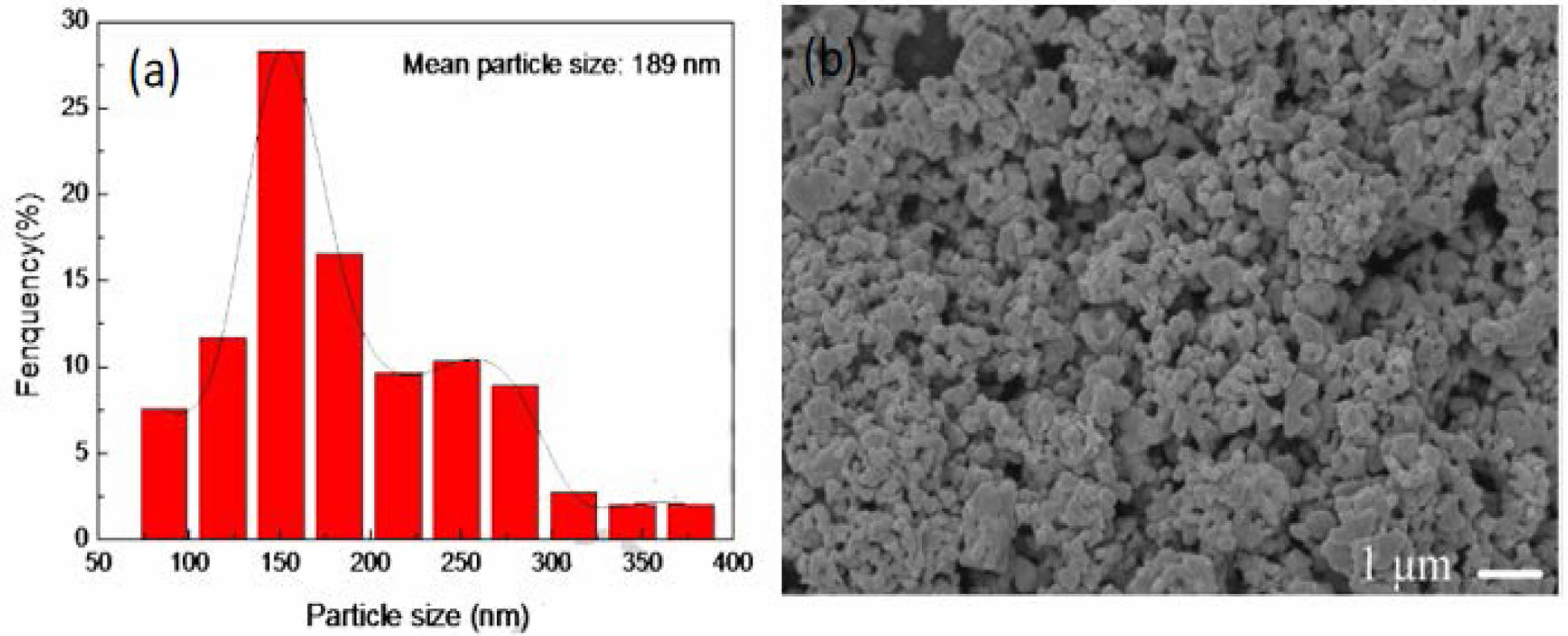 Fig. 5 (a) particle size distribution and (b) SEM image of ZrC powder synthesized by heating at 1600 ℃ for 2 h [34]. |
